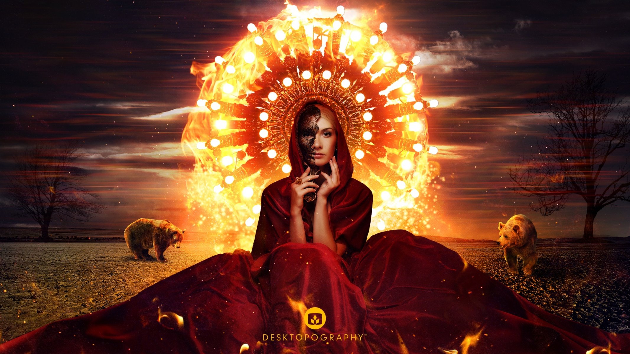 Fille mystérieuse dans un manteau sur un fond d'ours et de feu