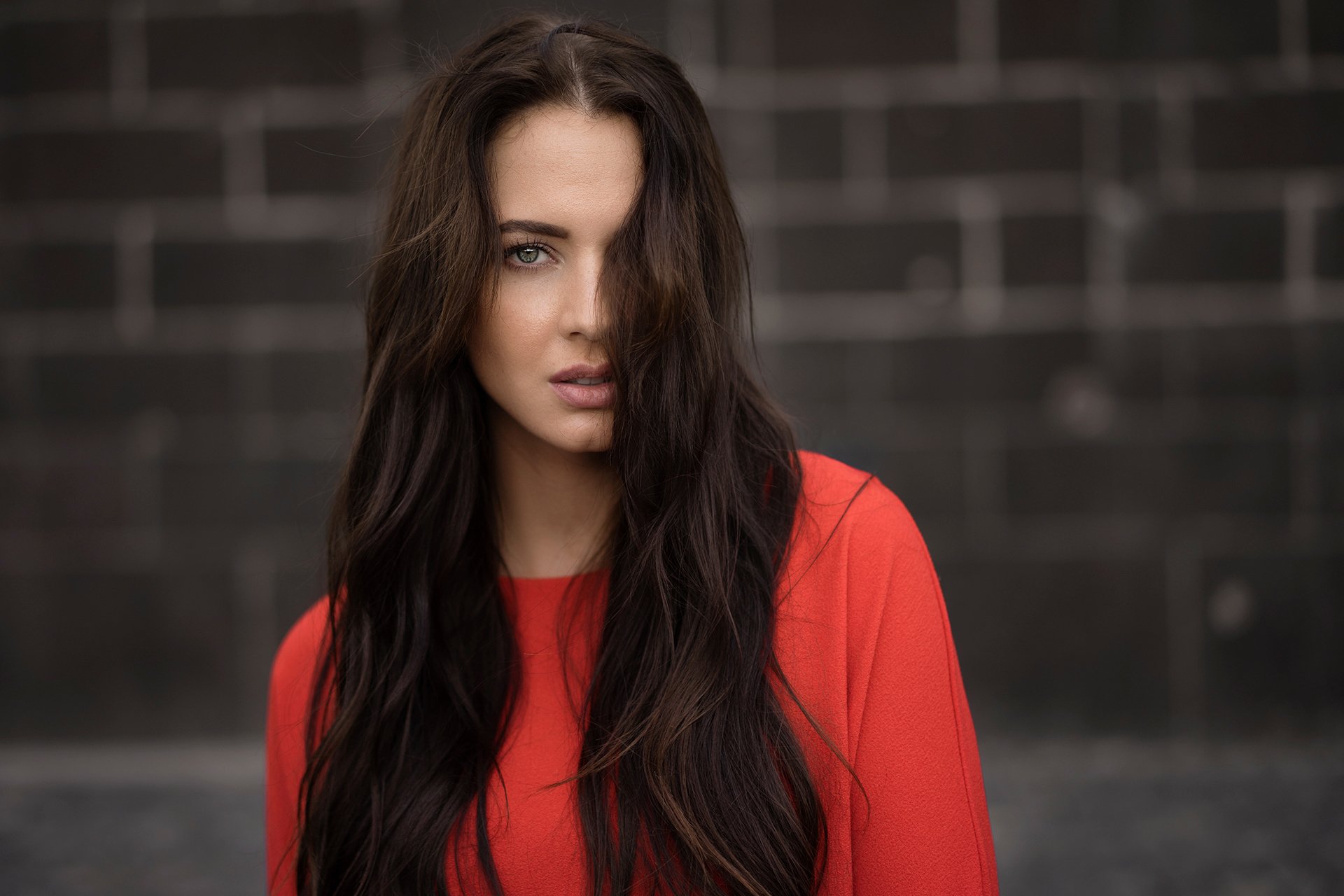 Belle photo de la jeune fille dans la rue vers le haut rouge