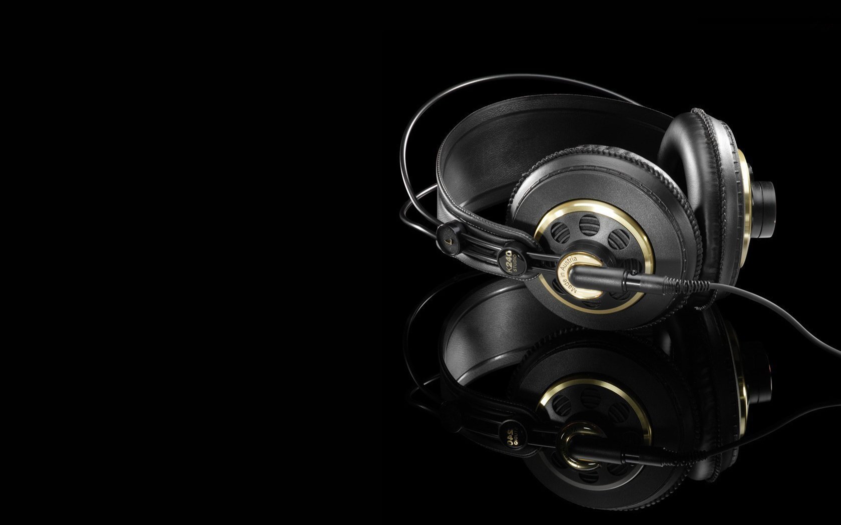 Les écouteurs noirs et dorés se reflètent dans la surface noire