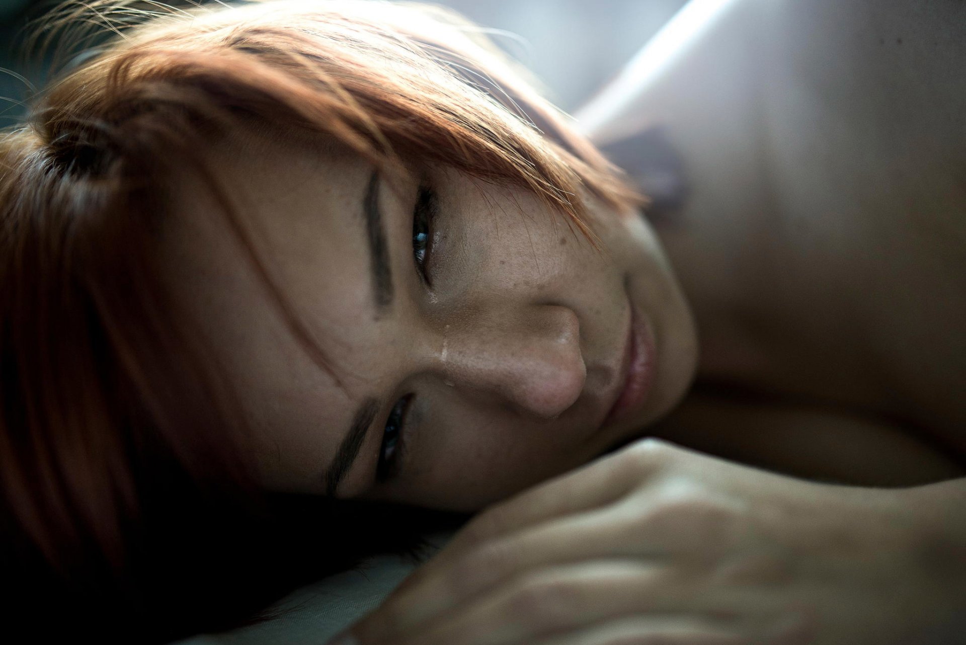 Fille rousse pleure. La jeune fille dans la dépression. Carré pour les roux