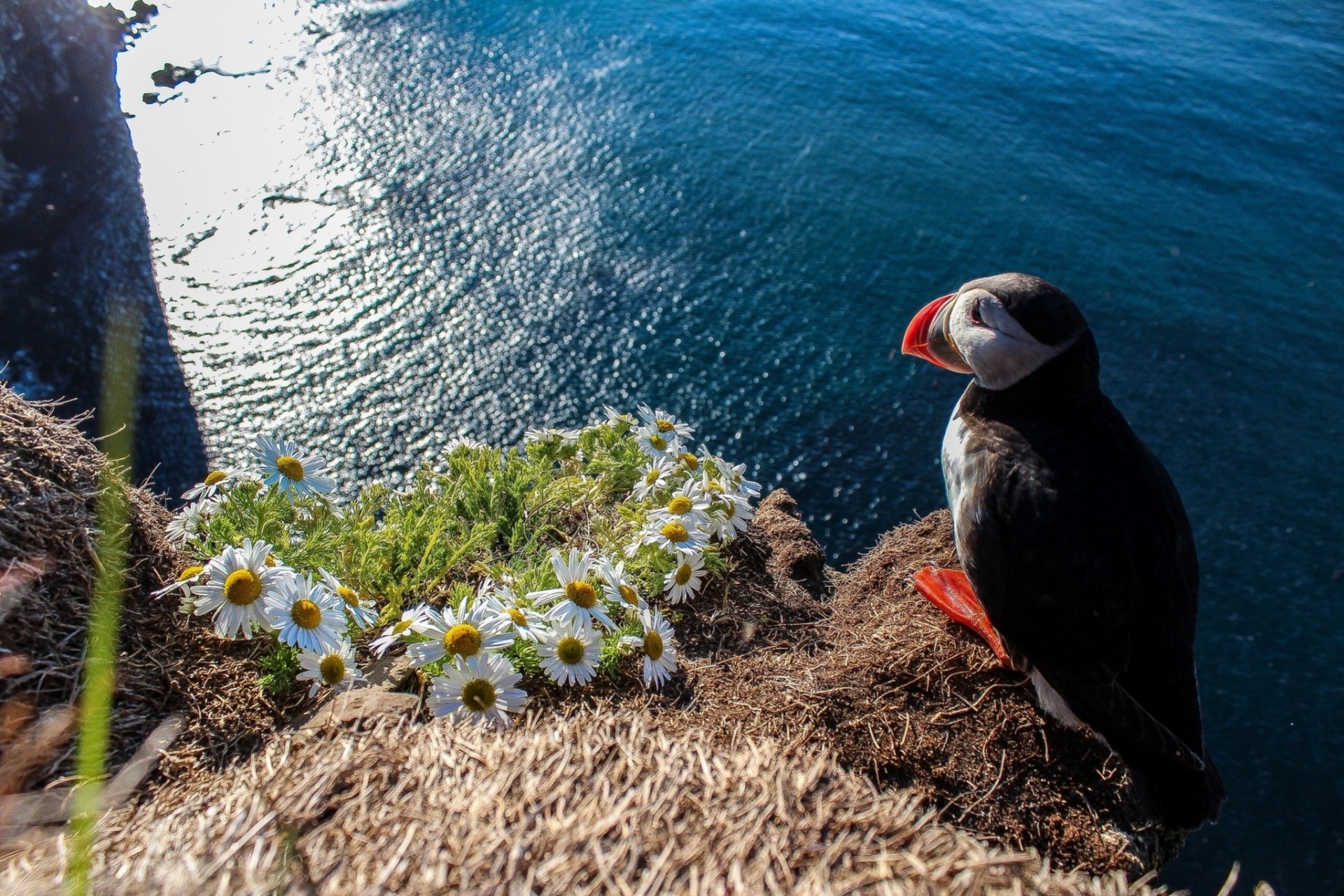 L'oiseau s'accroupit sur la pierre à côté des marguerites