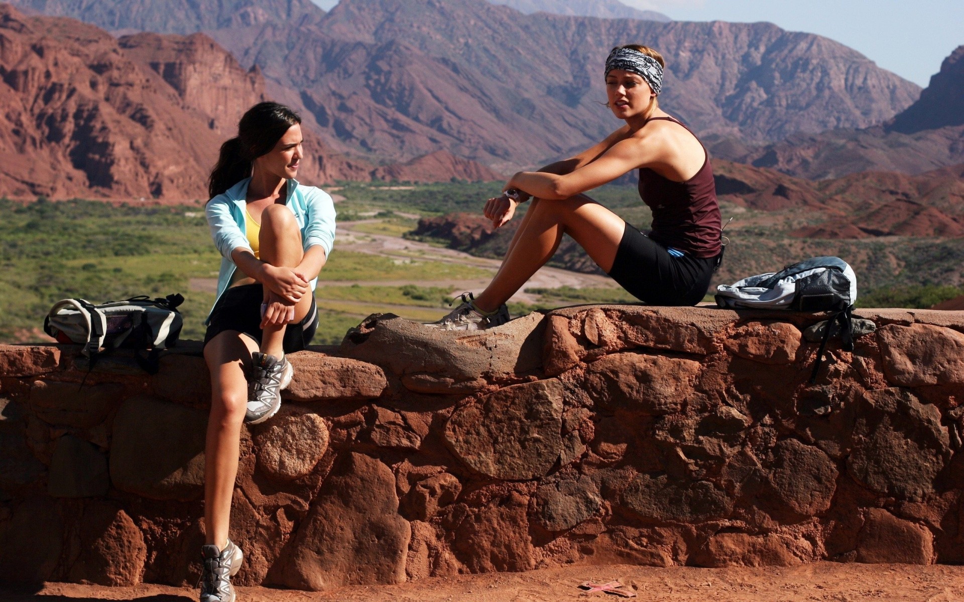 Les deux filles se sont accroupies pour se reposer sur les rochers. extrait du film