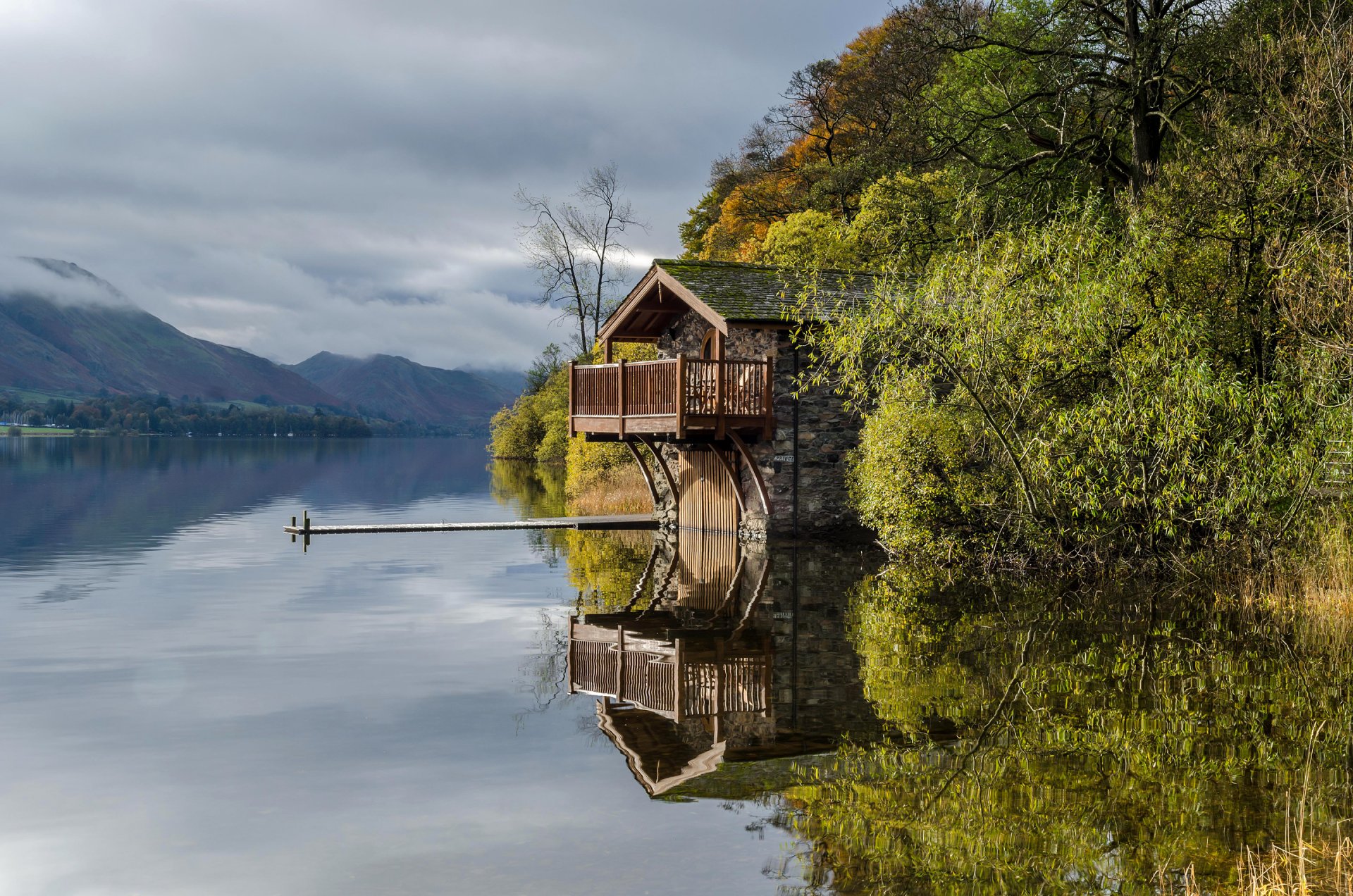 Maison sur les supports dans la forêt et les tulipes ci-dessous