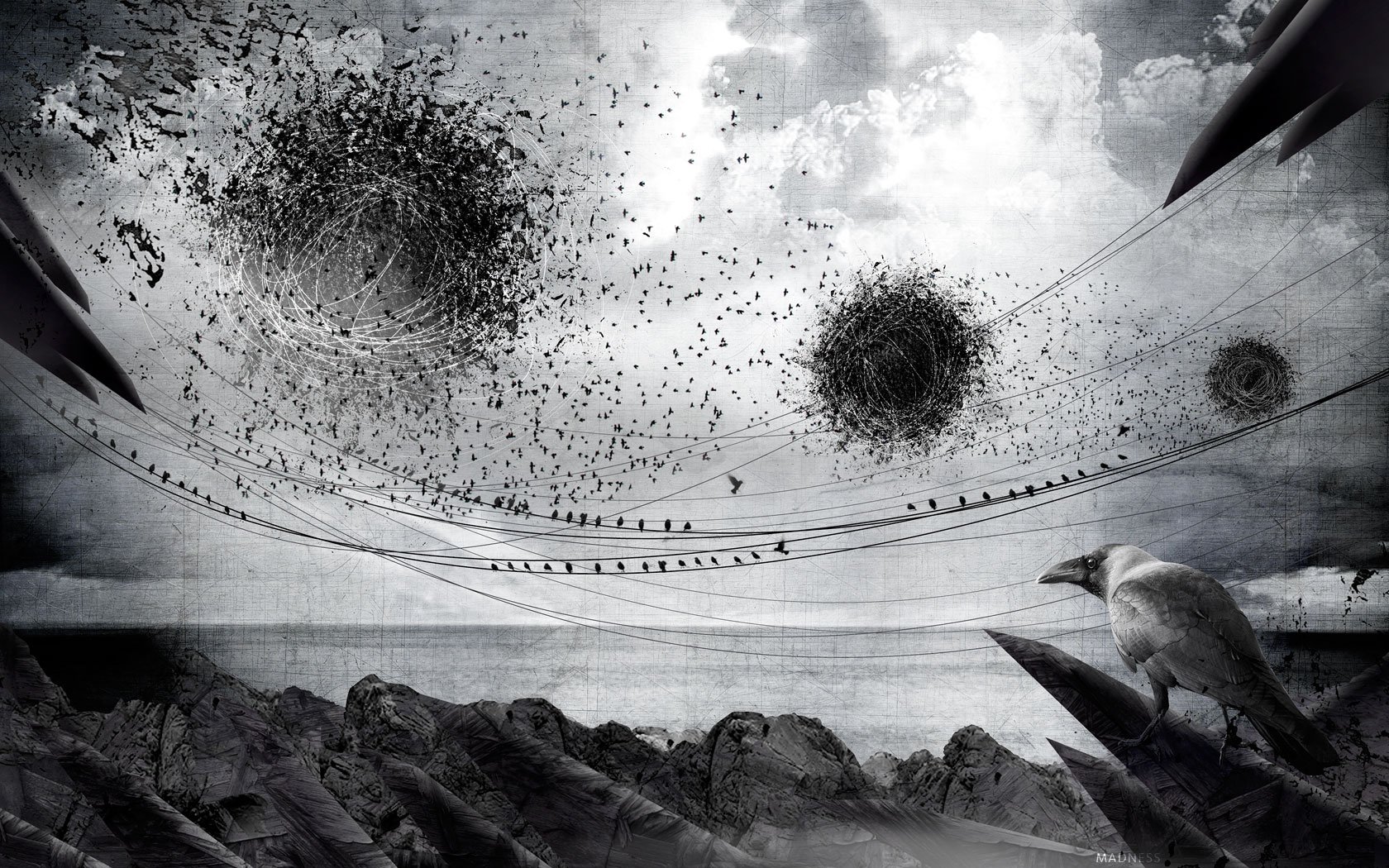 Essaim d'oiseaux sombres dans le ciel au-dessus de la friche
