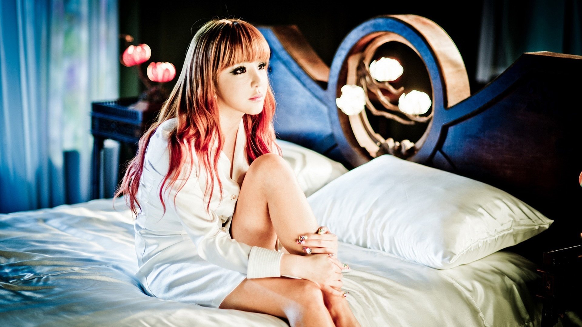 Fille asiatique en nuisette sur le lit entouré de lumières