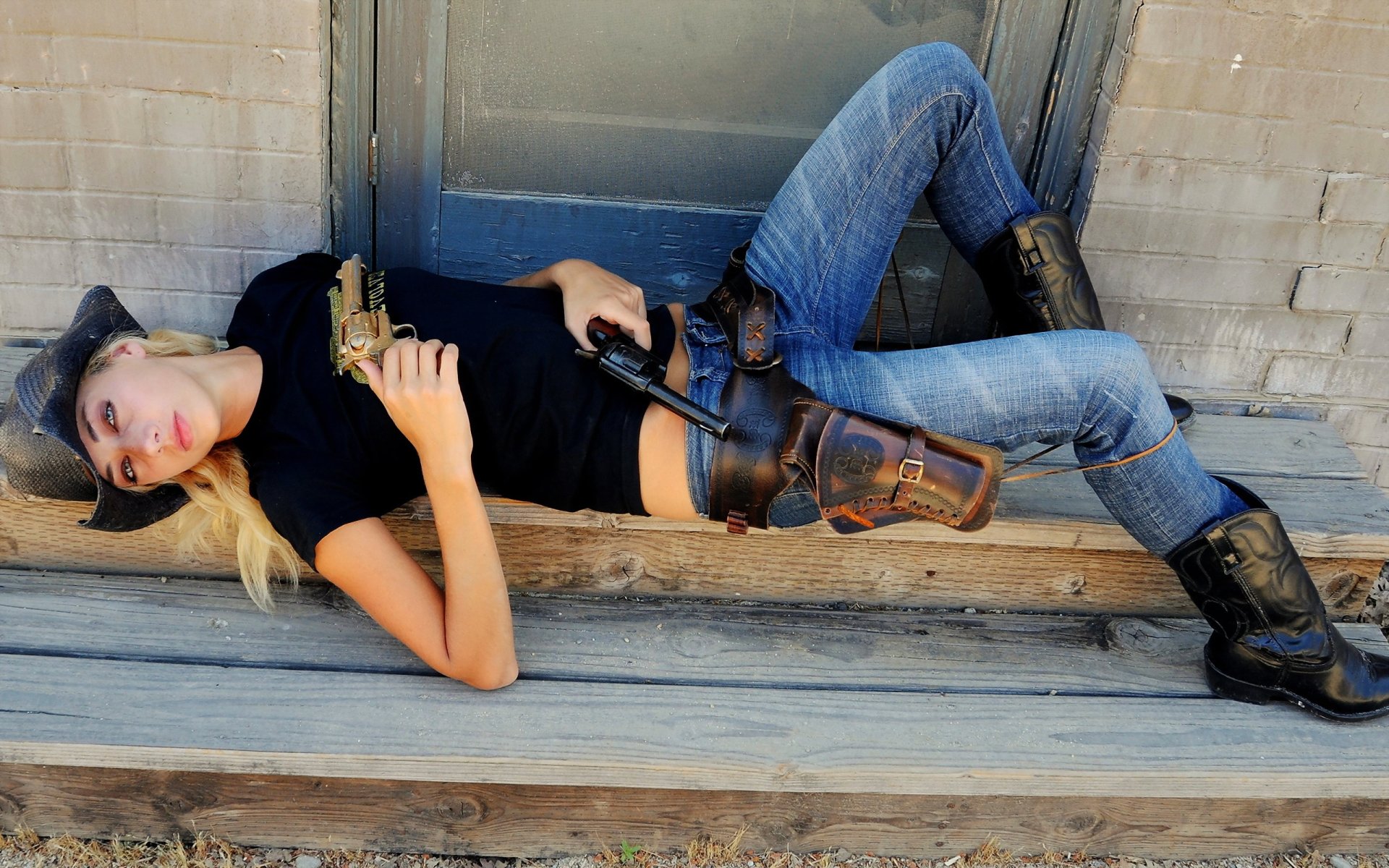 Lara Croft fille avec un pistolet et un brassard sur le bras