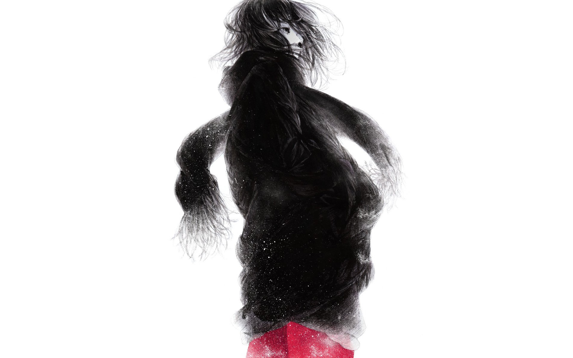 Dessin d'une jeune fille en écharpe dans le vent avec des flocons de neige