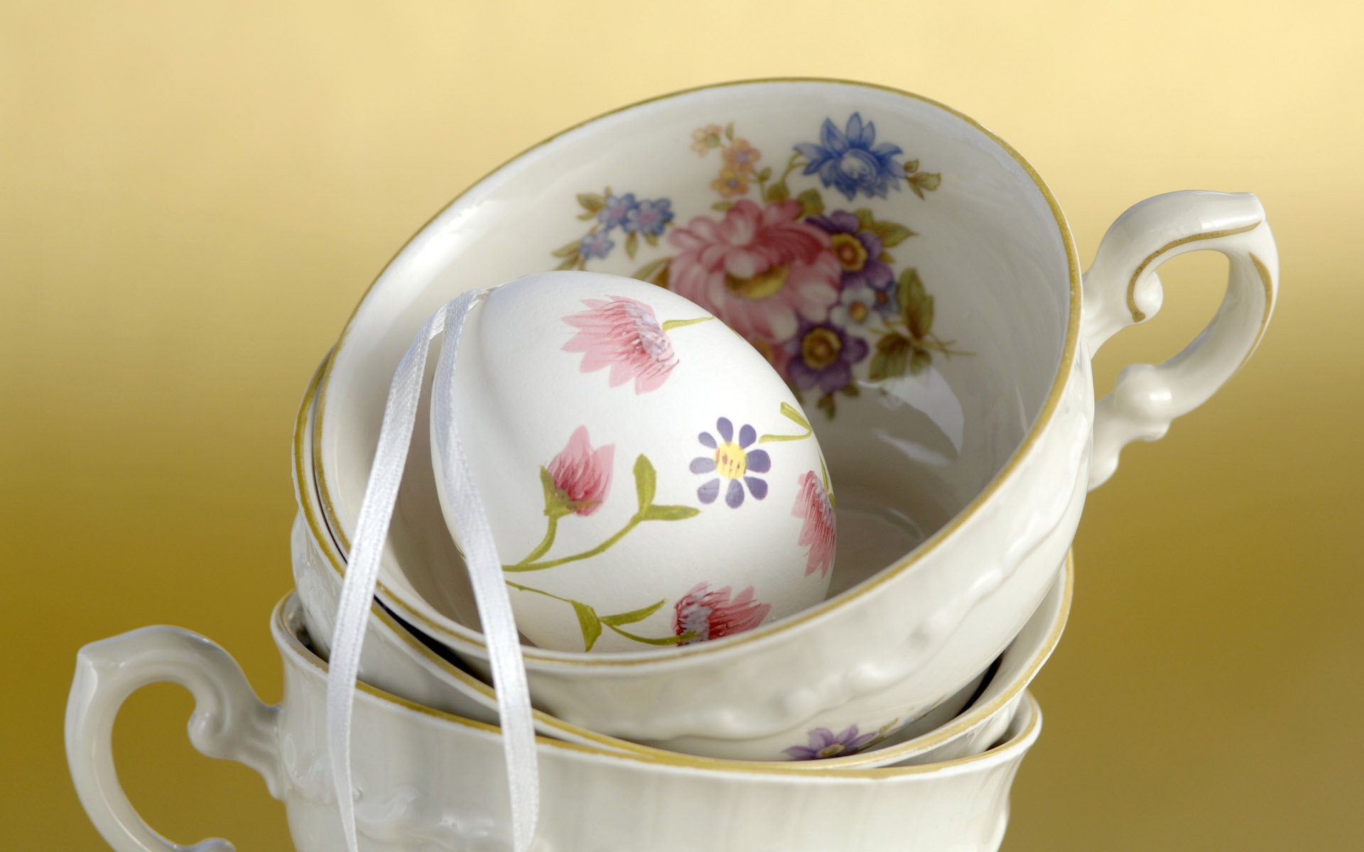 Nature morte avec un vase avec des bleuets, une tasse de thé et un lapin en porcelaine