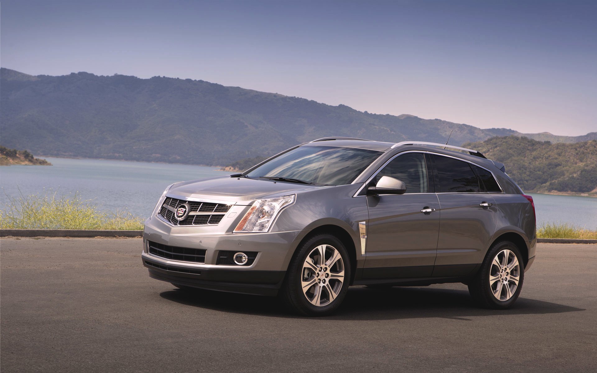 Cadillac srx SUV gris sur fond de montagnes