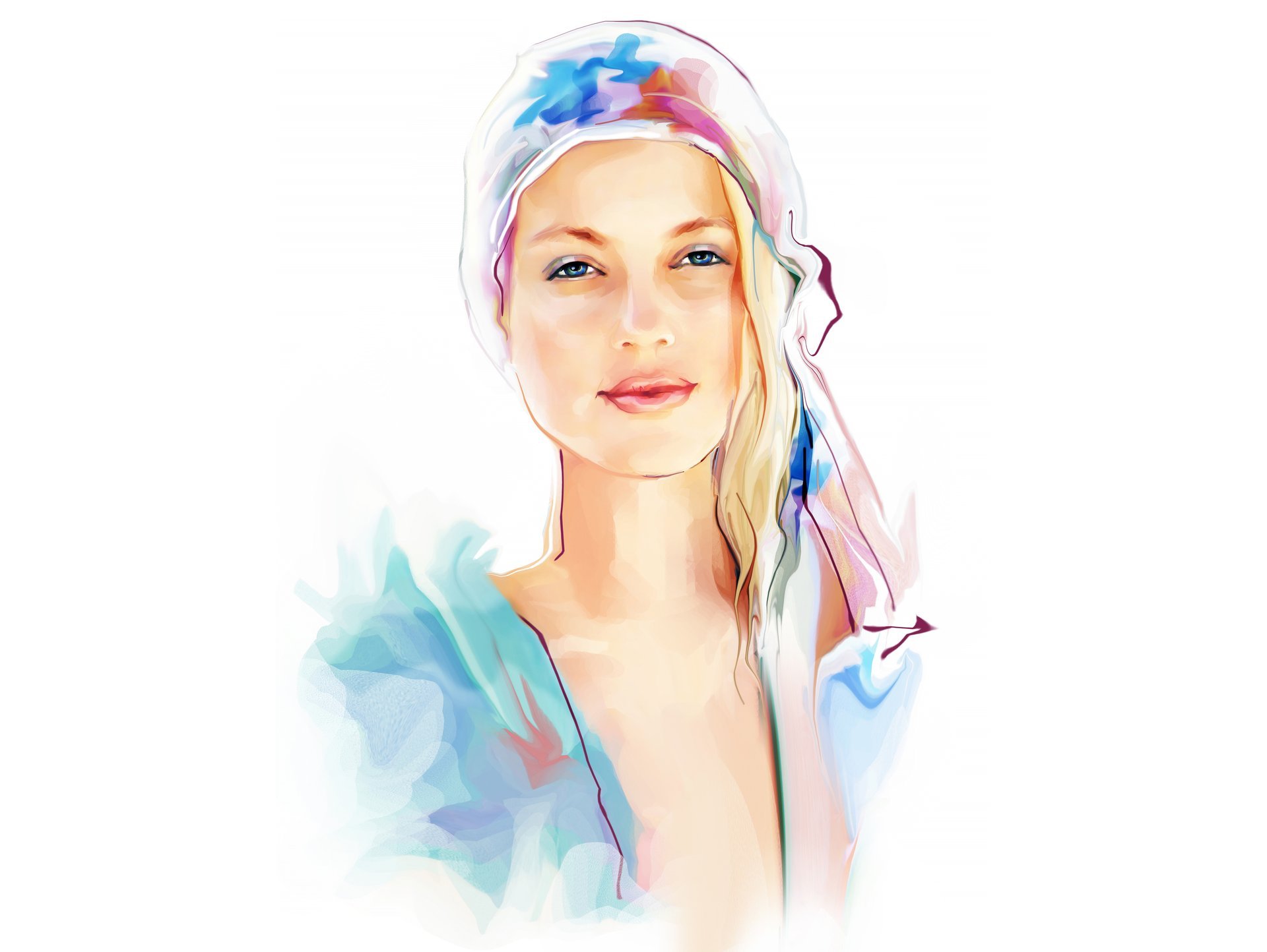 Tatiana Nikitina. Jeune fille en robe rouge est assis avec une tasse de café dans les mains