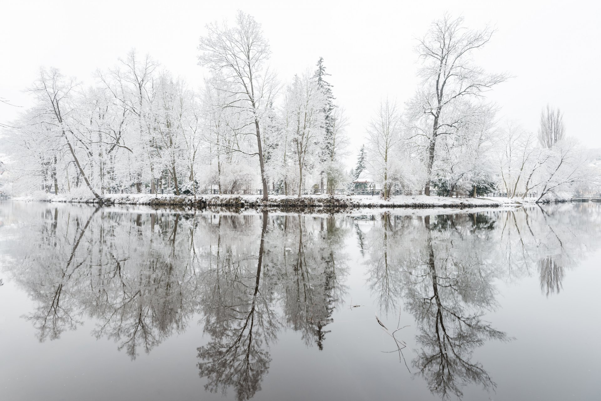 Les arbres dans la forêt d'hiver se reflètent dans le calme de la rivière