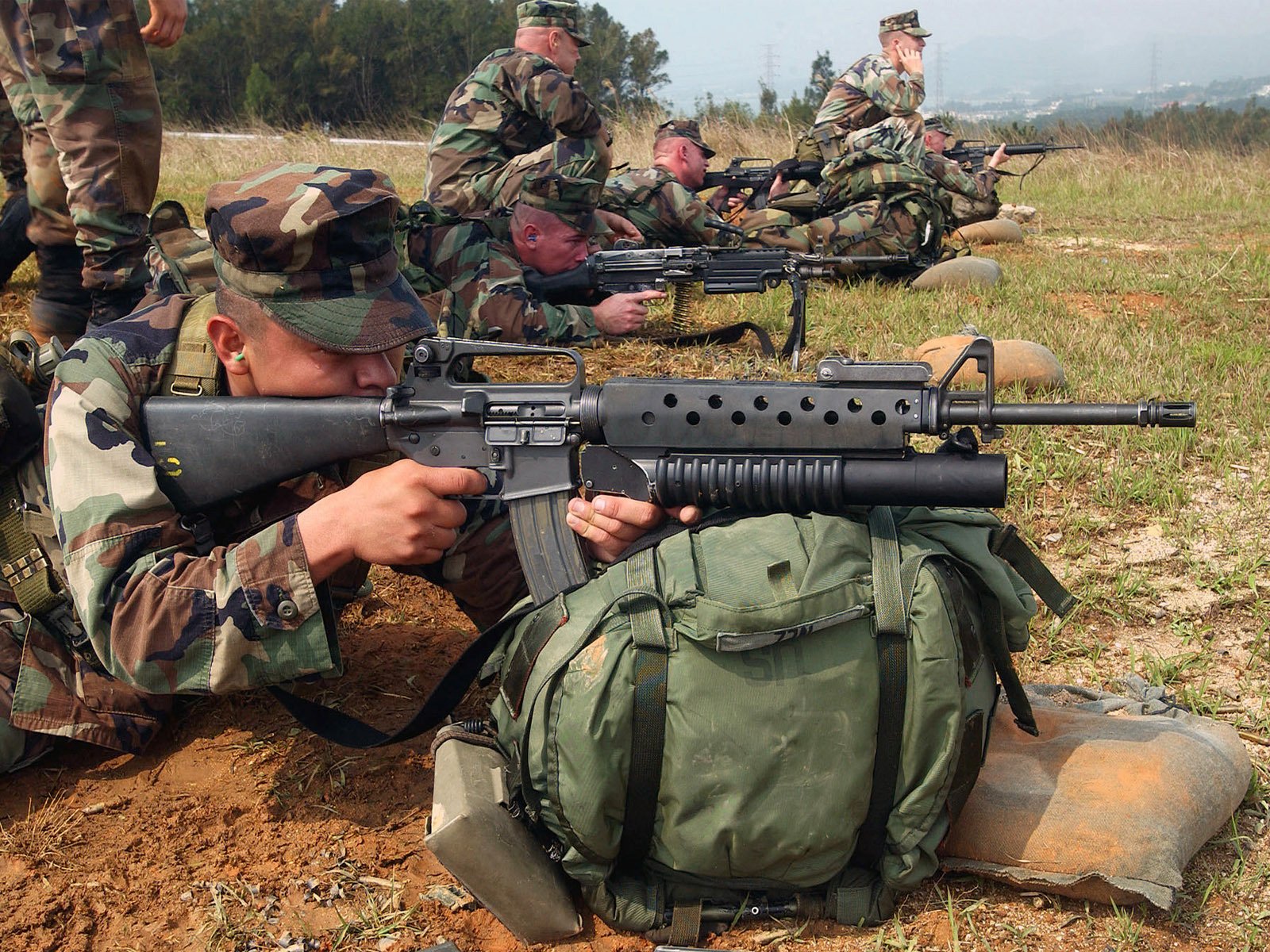 Soldats avec des fusils d'assaut et des sacs à dos sur le terrain d'entraînement