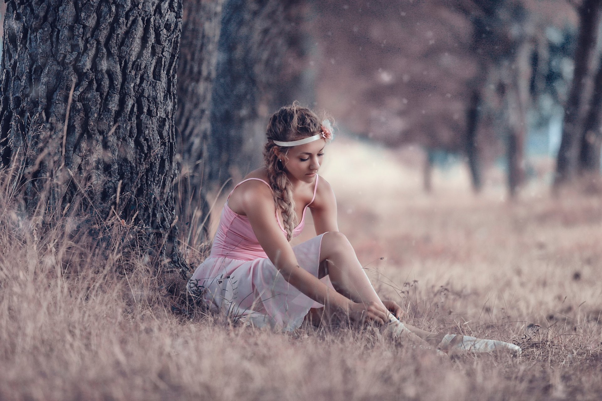 Une fille de ballerine assise près d'un arbre, le met sur les pointes