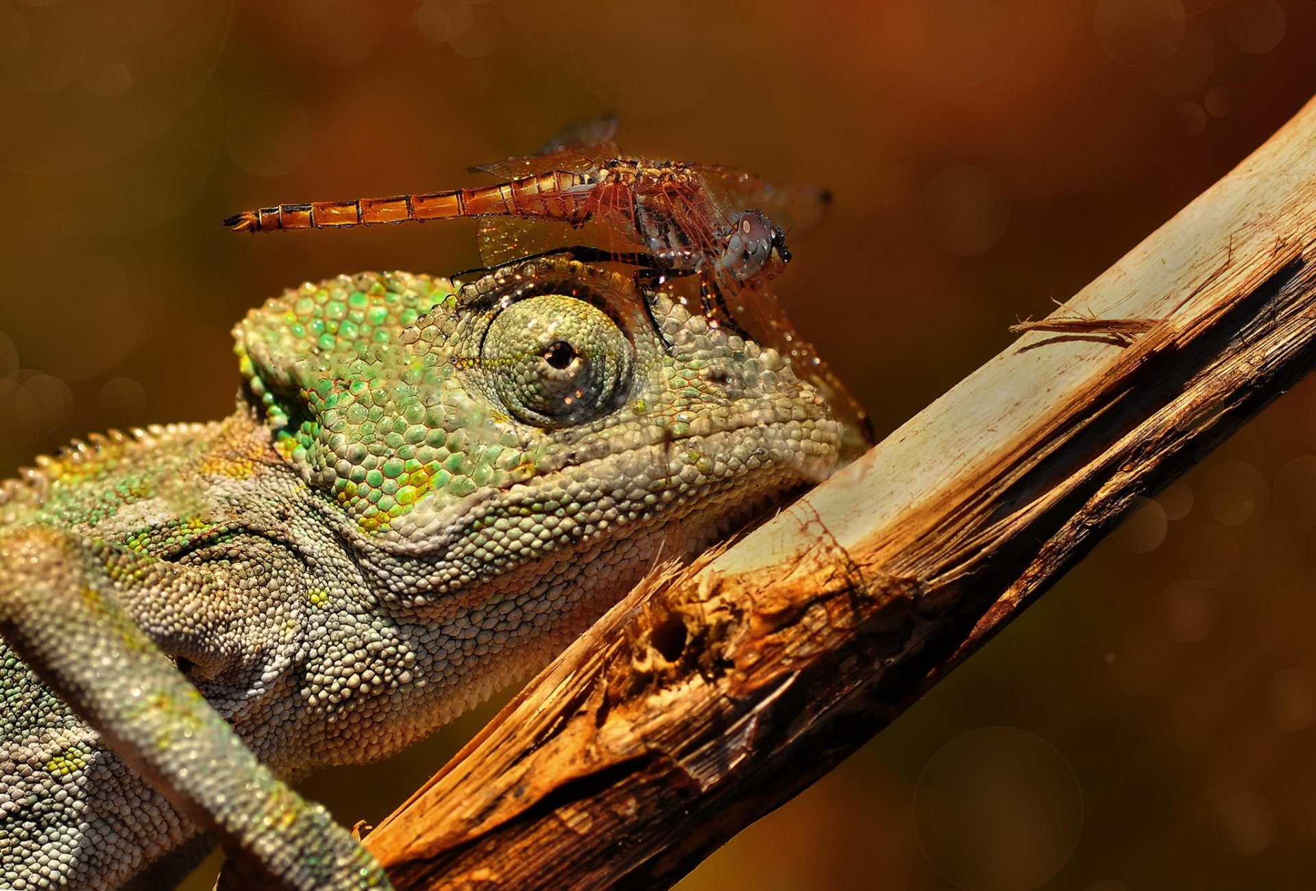 Gros plan de tir d'une libellule assis sur la tête d'un caméléon