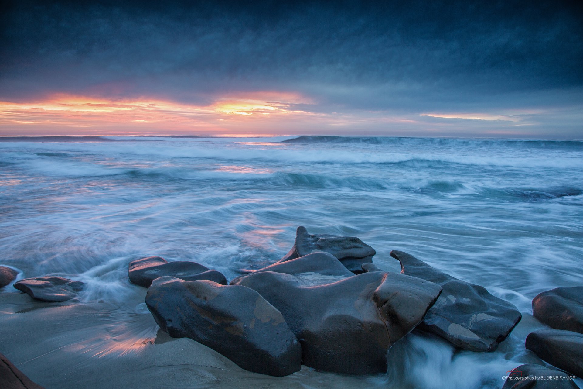 Les éclaboussures de vagues dans le surf tombent sur les rochers