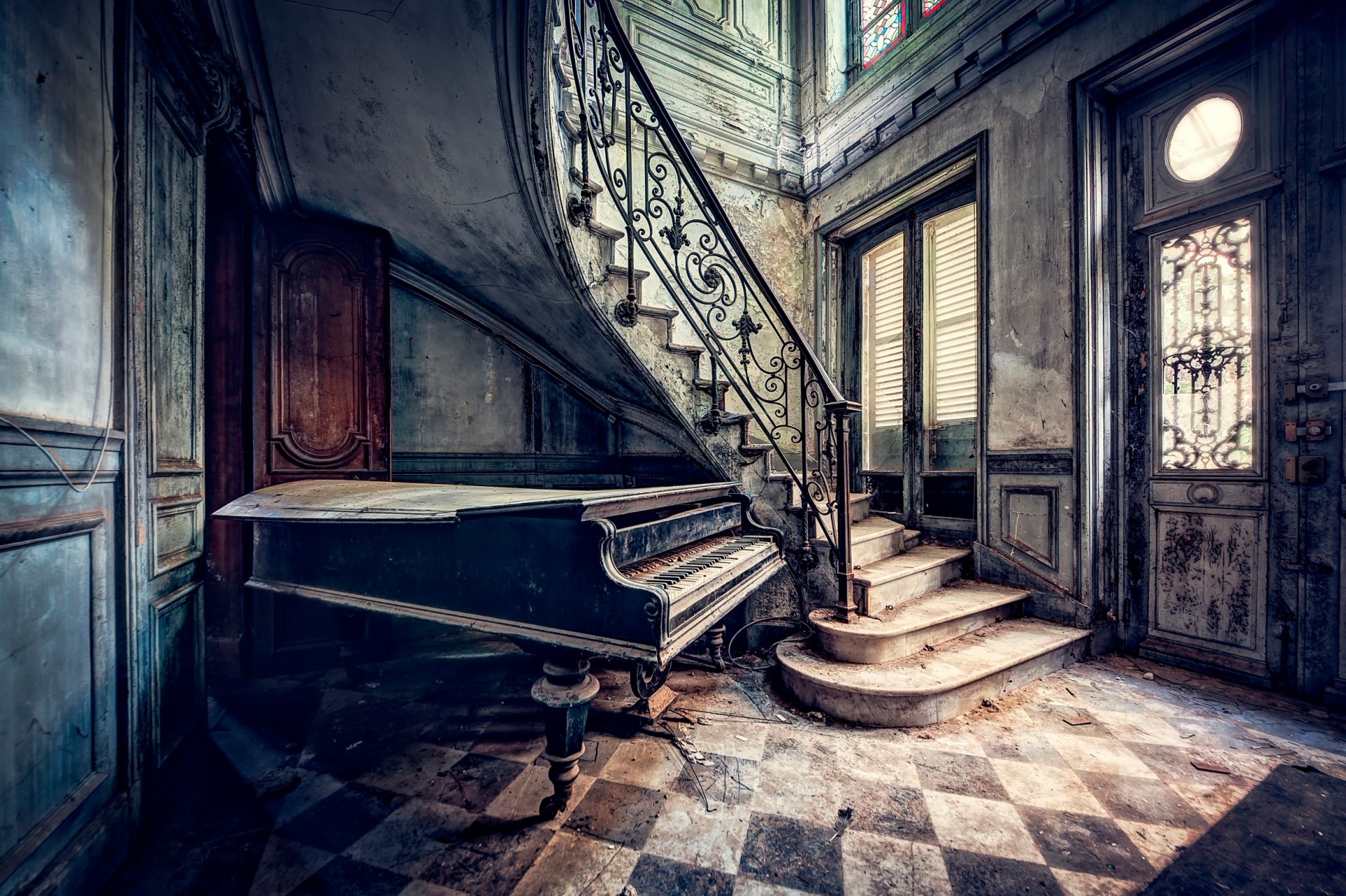 Vieux piano sous les escaliers dans une maison ancienne