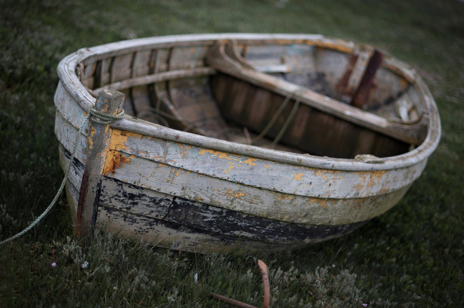 Vieux bateau fané debout sur l'herbe verte