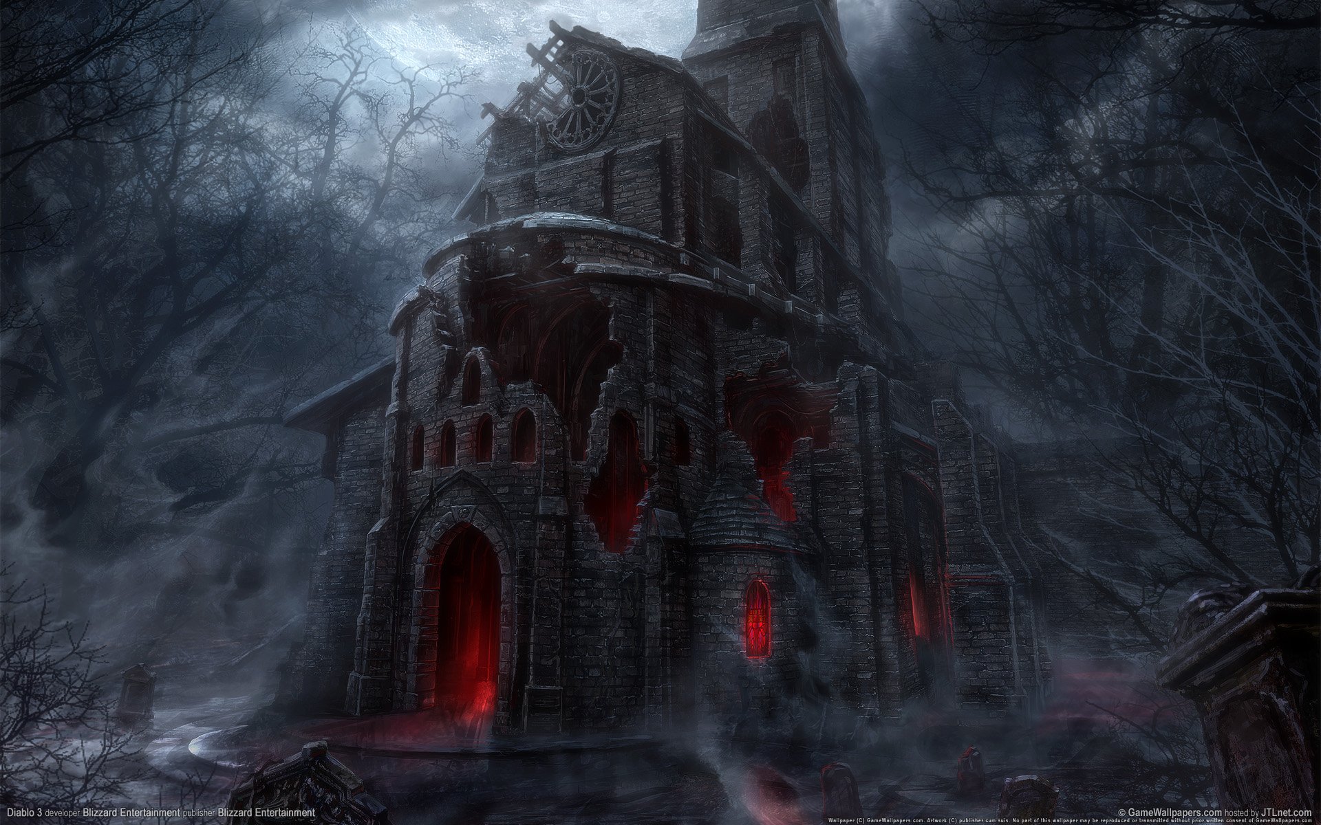 L'église dans la nuit, les ruines et la peur enveloppent cet endroit, une lueur sinistre, la sphère du magnifique jeu diablo