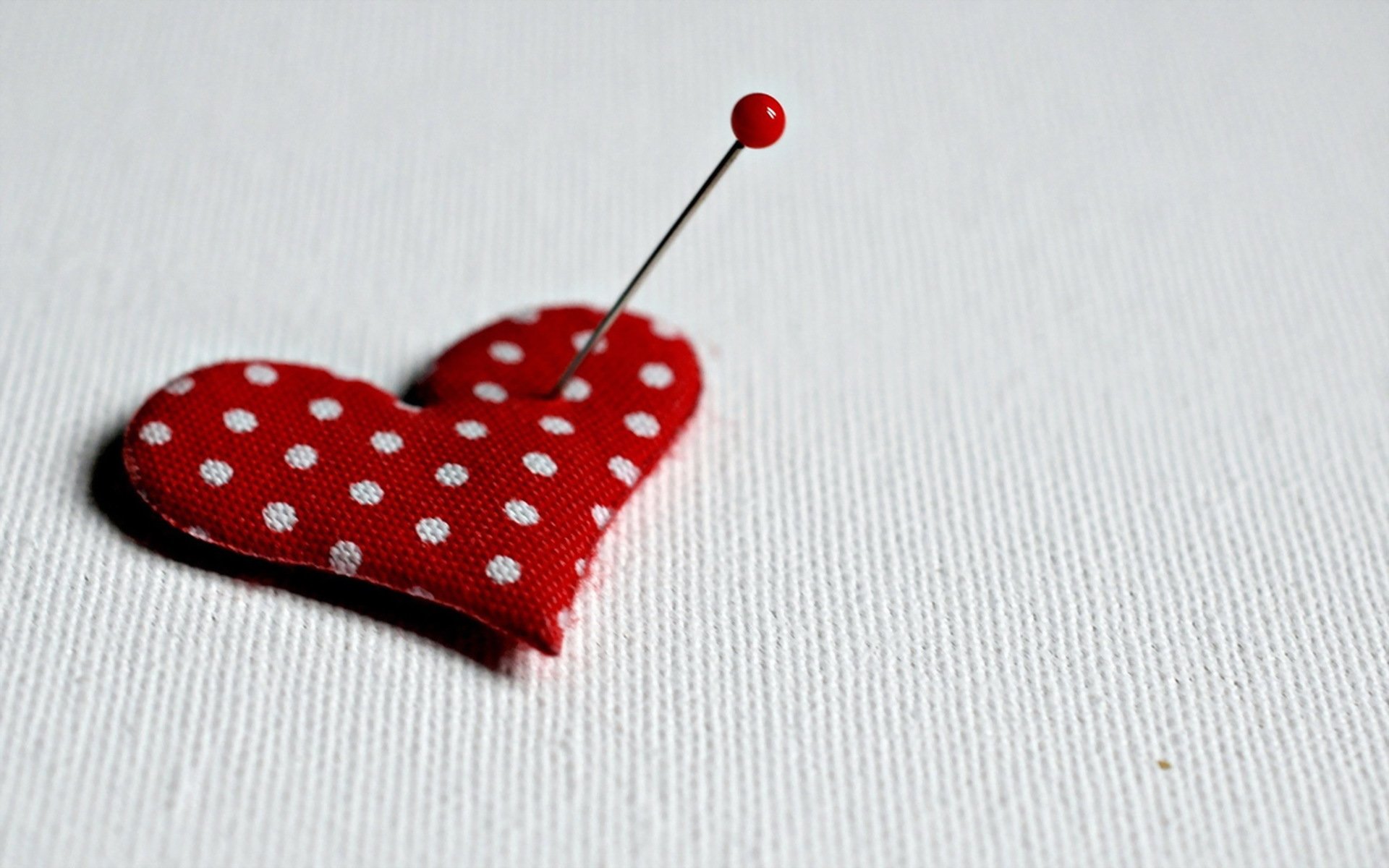 Un coeur saignant, percé, cousu. Coeur collé au mur sur du scotch
