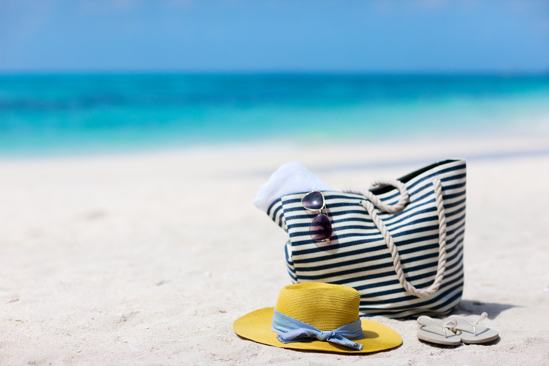 Sac et chapeau sur la plage de sable de la mer bleue