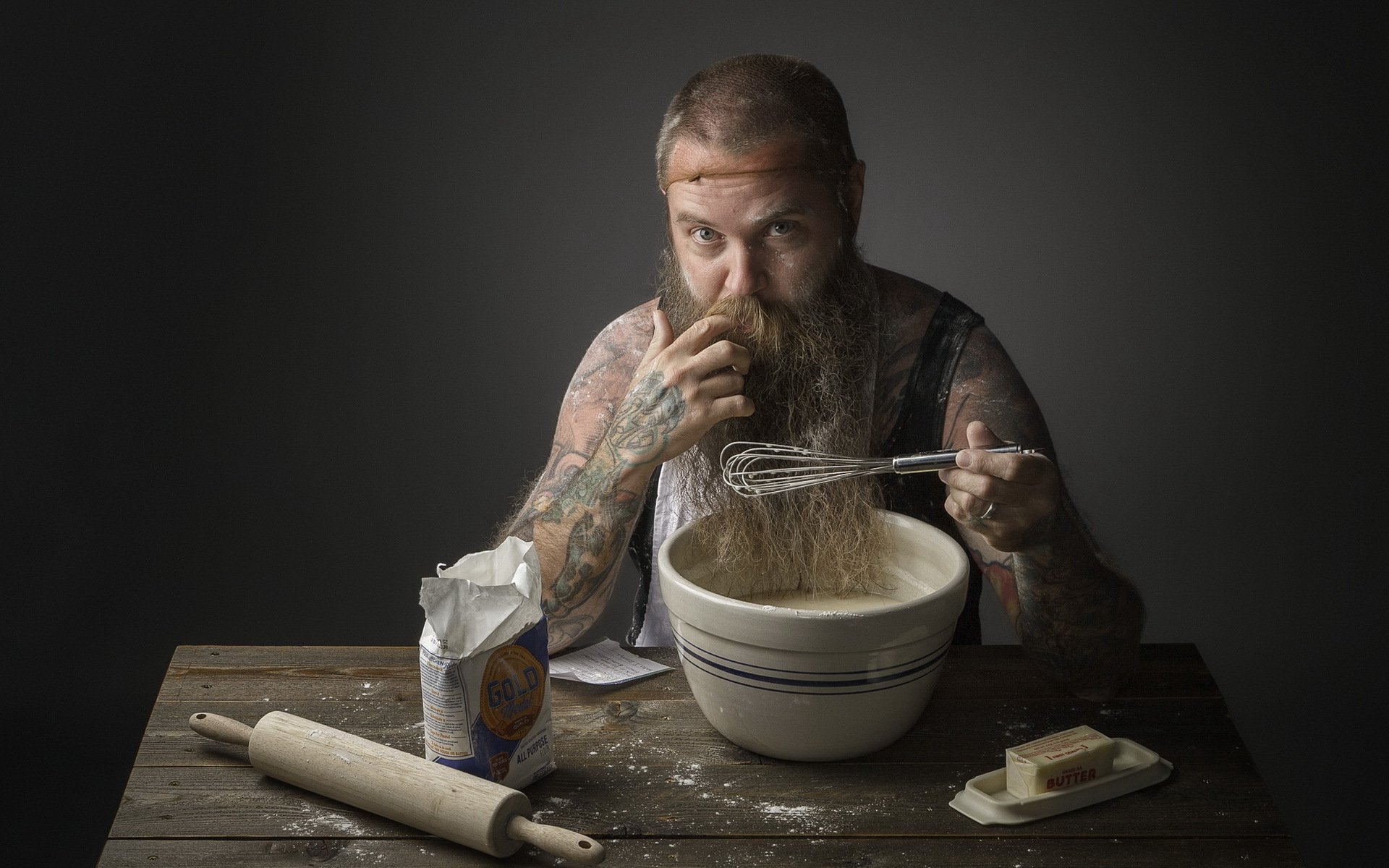 Un homme avec un chapeau et des tatouages barbouillé de mousse longue barbe
