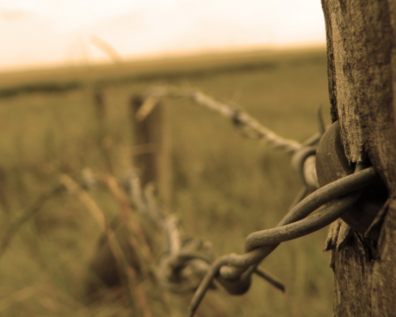 PVC bleu voiture sur fond de clôture avec fil de fer barbelé