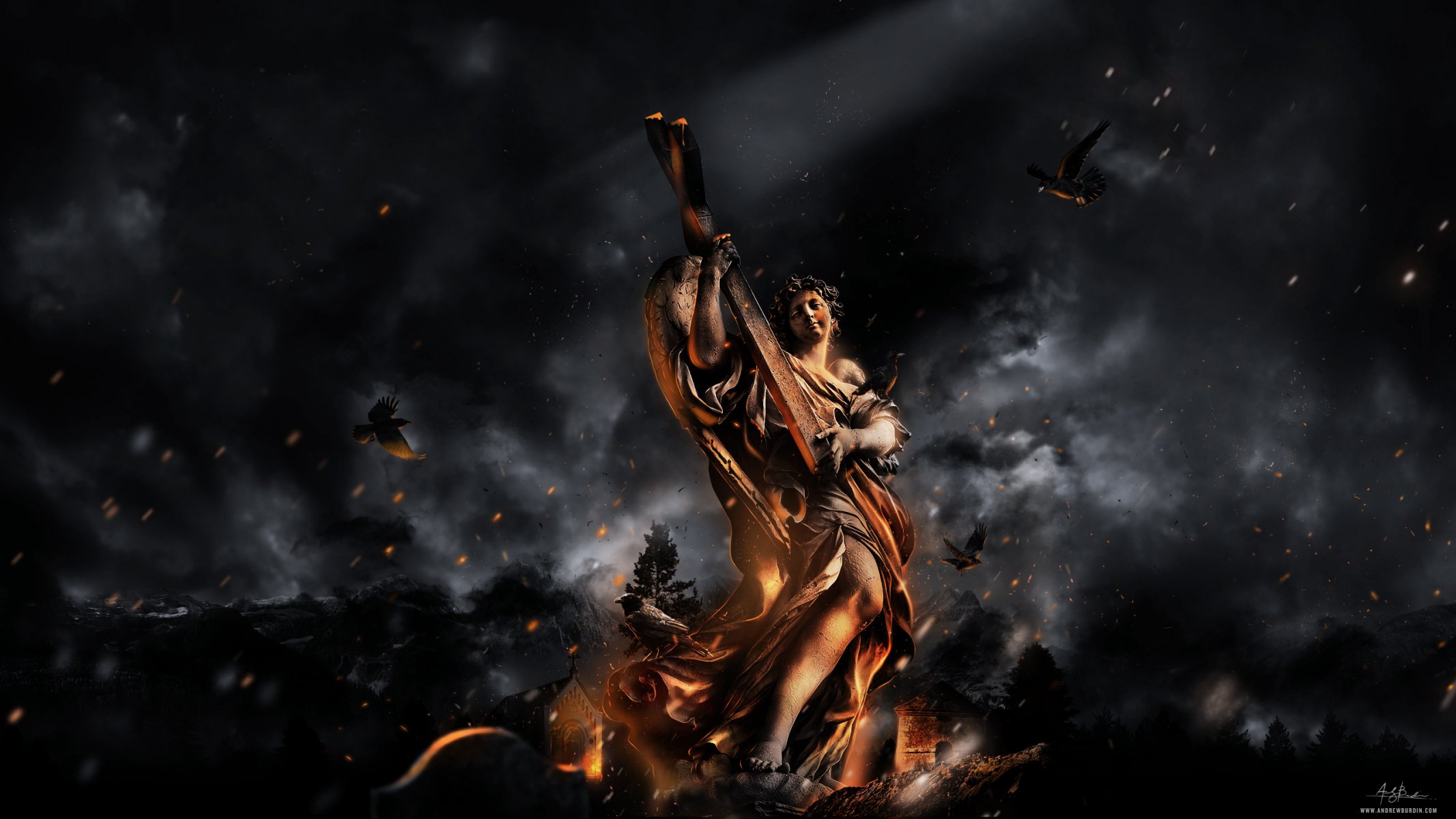 Statue avec une croix en feu et les oiseaux volent au-dessus de la cendre