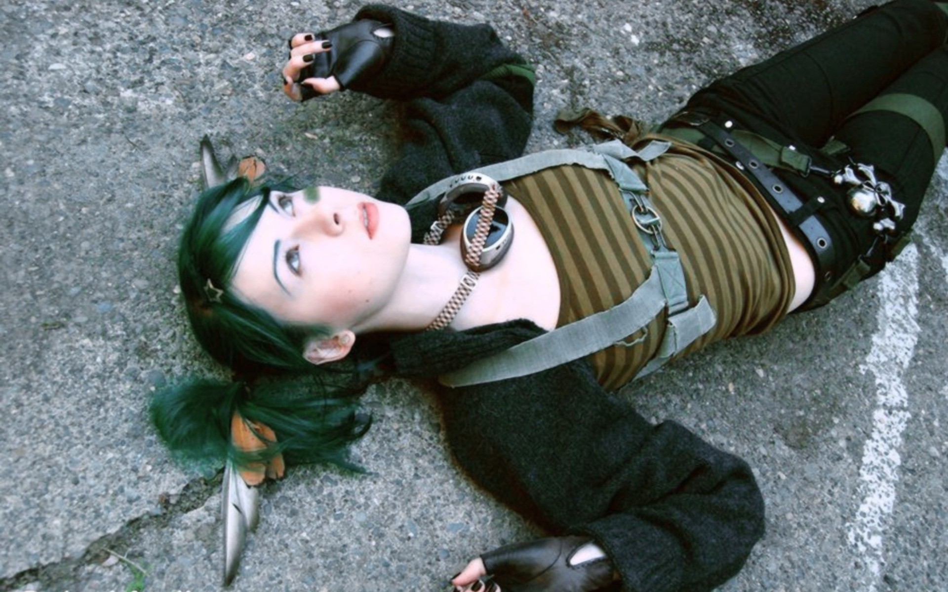 Fille aux cheveux verts se trouve sur l'asphalte