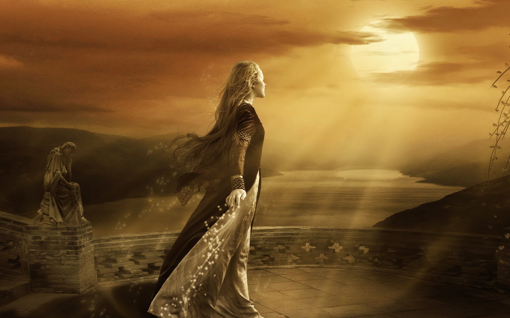 Fille dans les reflets du soleil se frayant un chemin à travers le ciel sombre