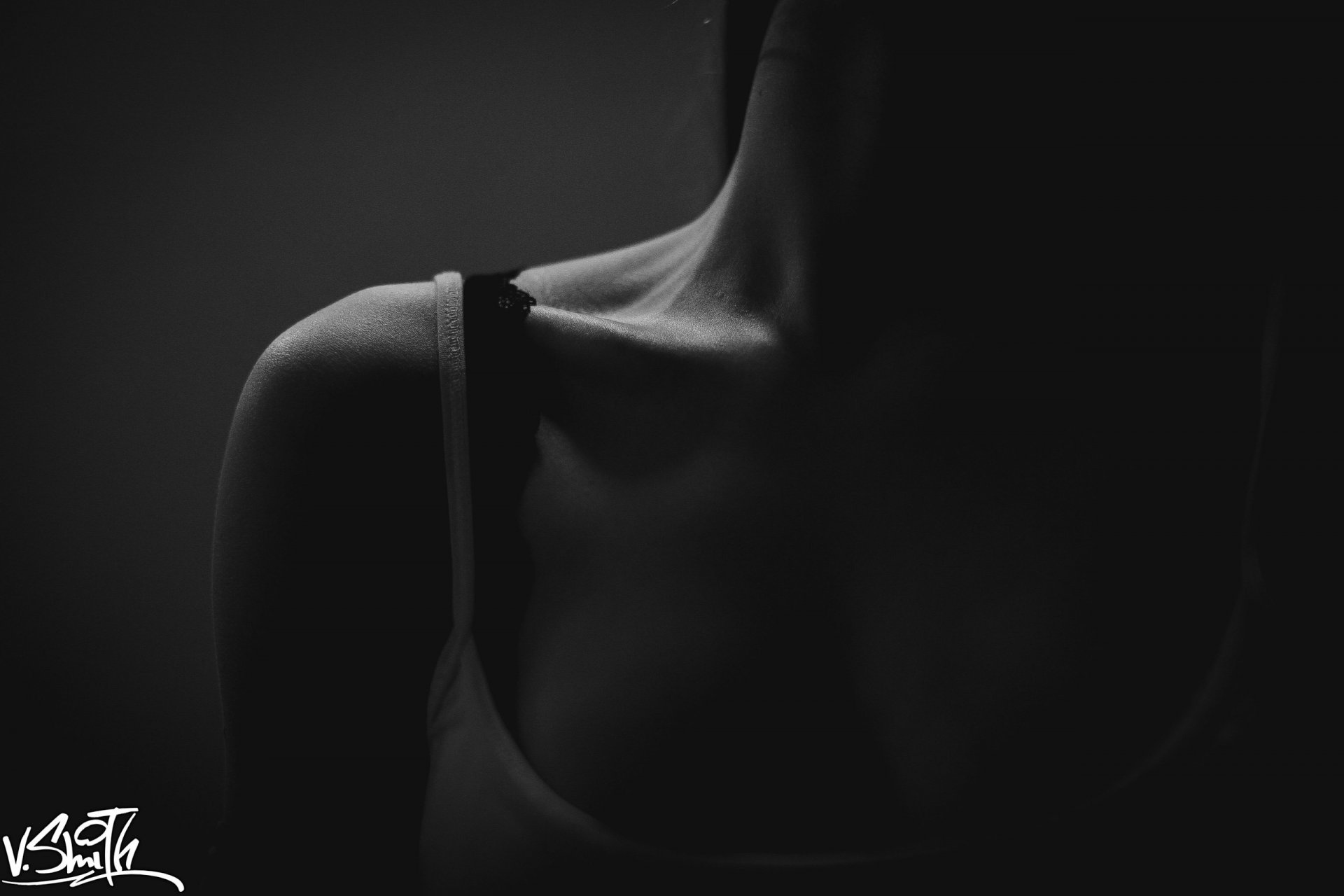 Clavicule féminine en t-shirt blanc sur fond gris foncé