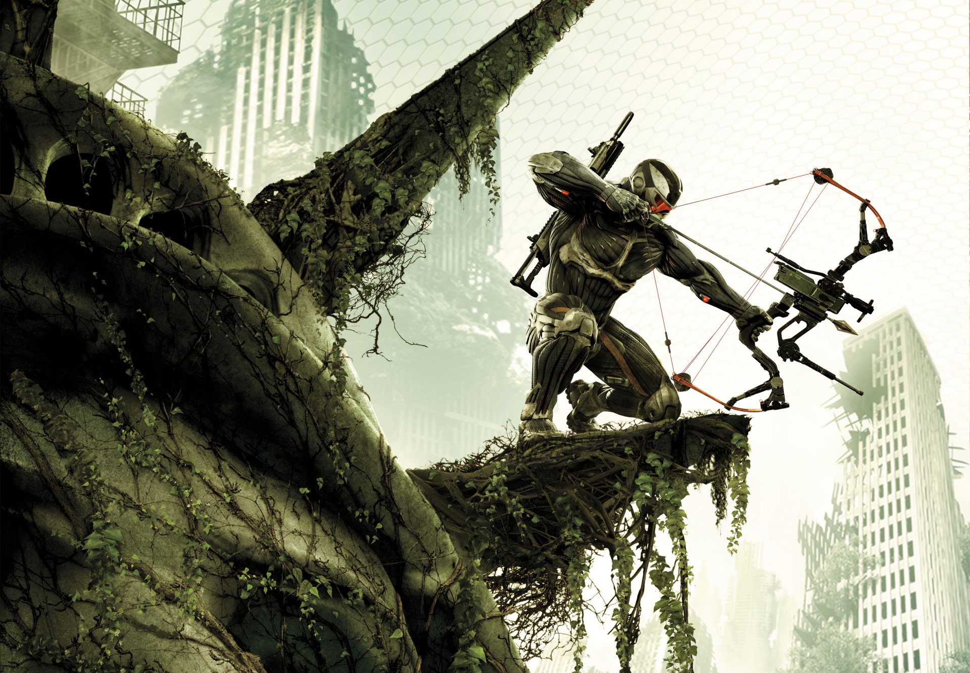 Jeu de tir crysis 3 par crytek soldat en nanocostume sur le fond d une ville détruite