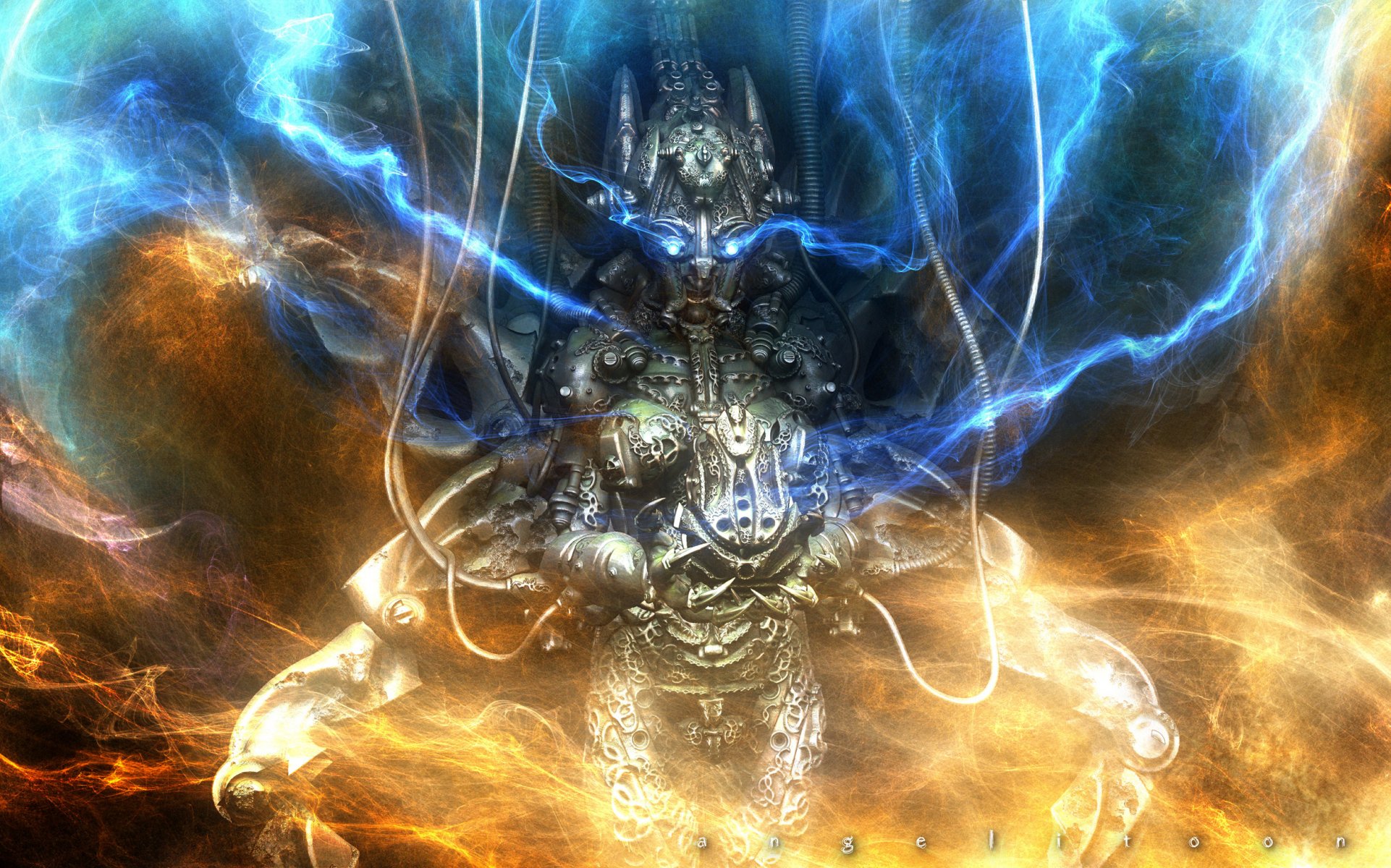 Un robot dans un casque. Le bleu des décharges de la foudre
