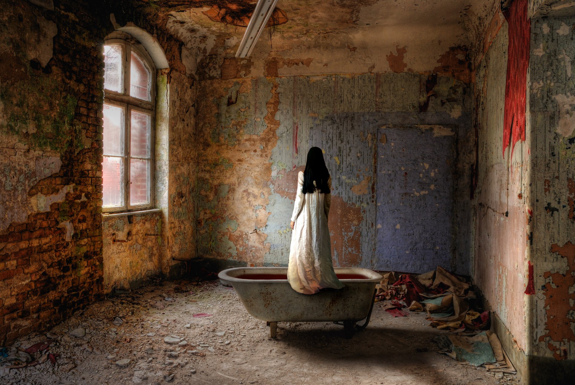 La jeune fille dans la salle de bains dans le bâtiment abandonné