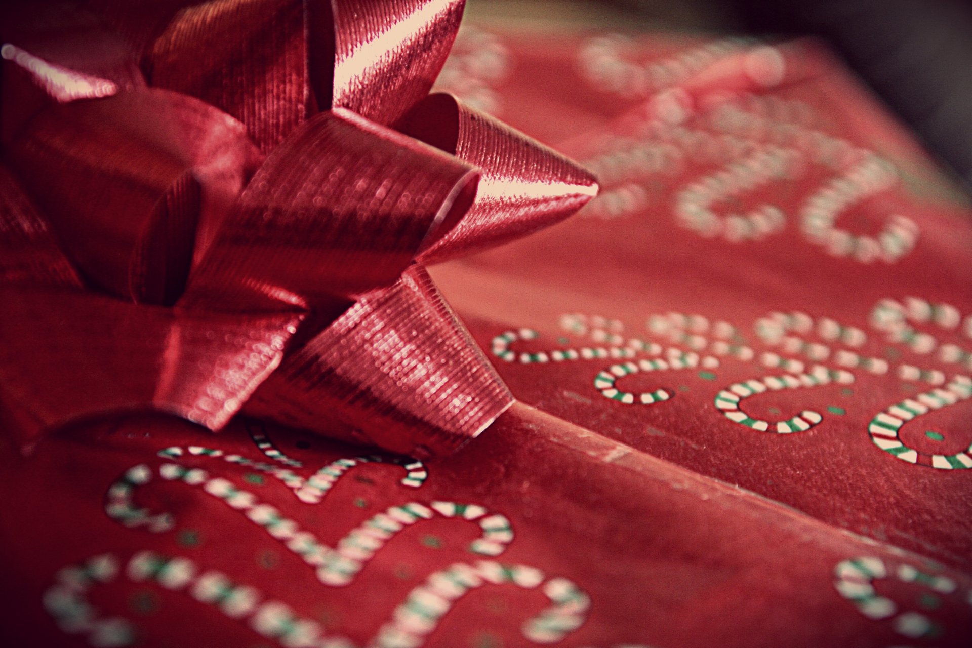Cadeau dans un emballage rouge près d'un clinquant bleu