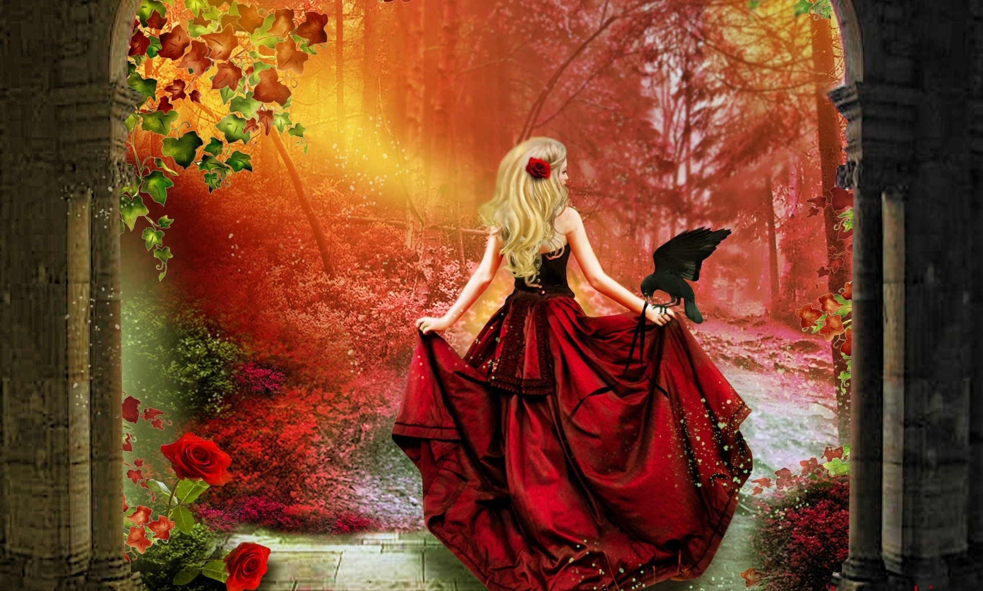 Fantasmagorie. Fille en robe rouge dans la forêt