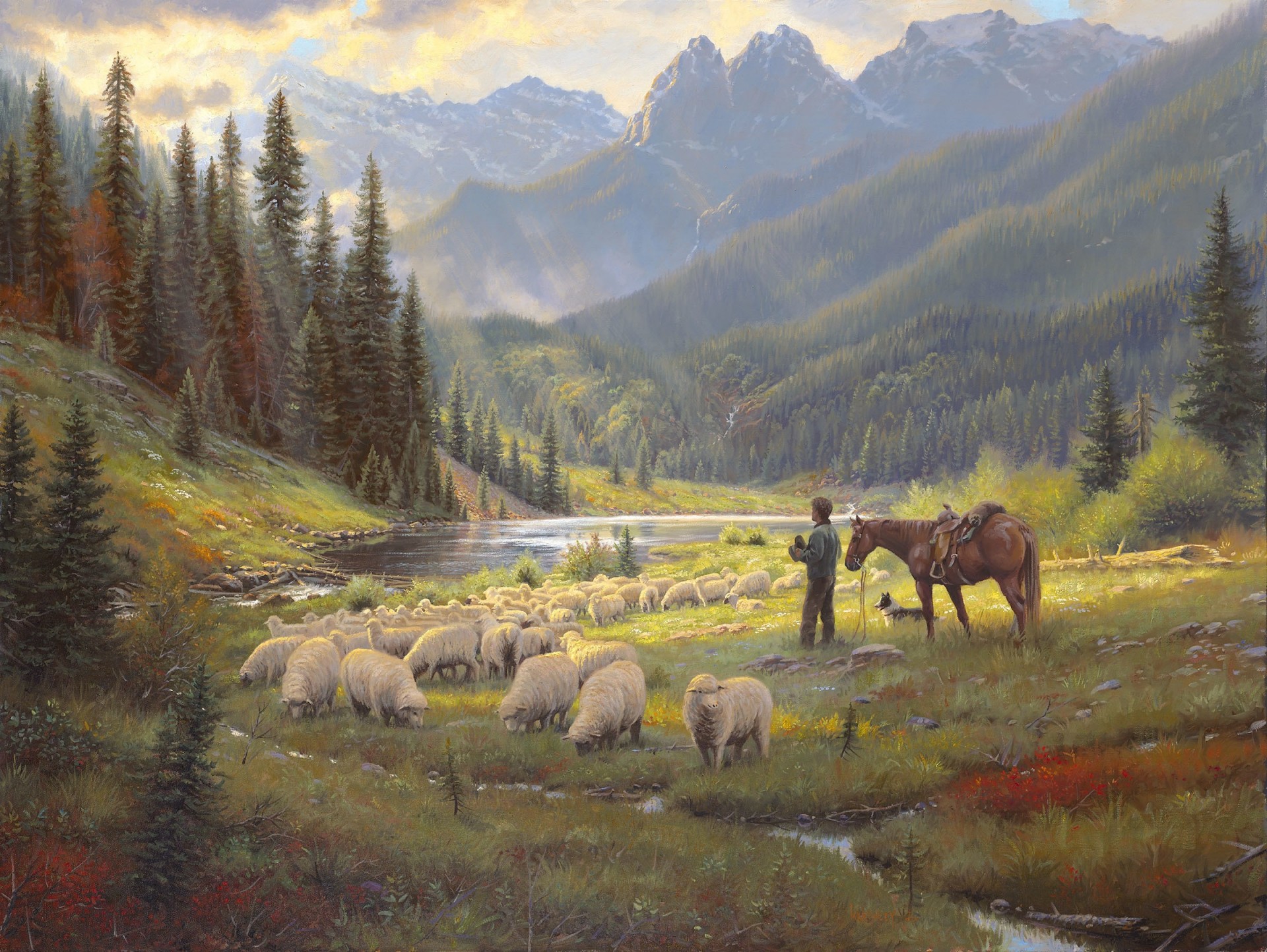 Berger avec un cheval et un chien garde un troupeau de moutons dans les montagnes