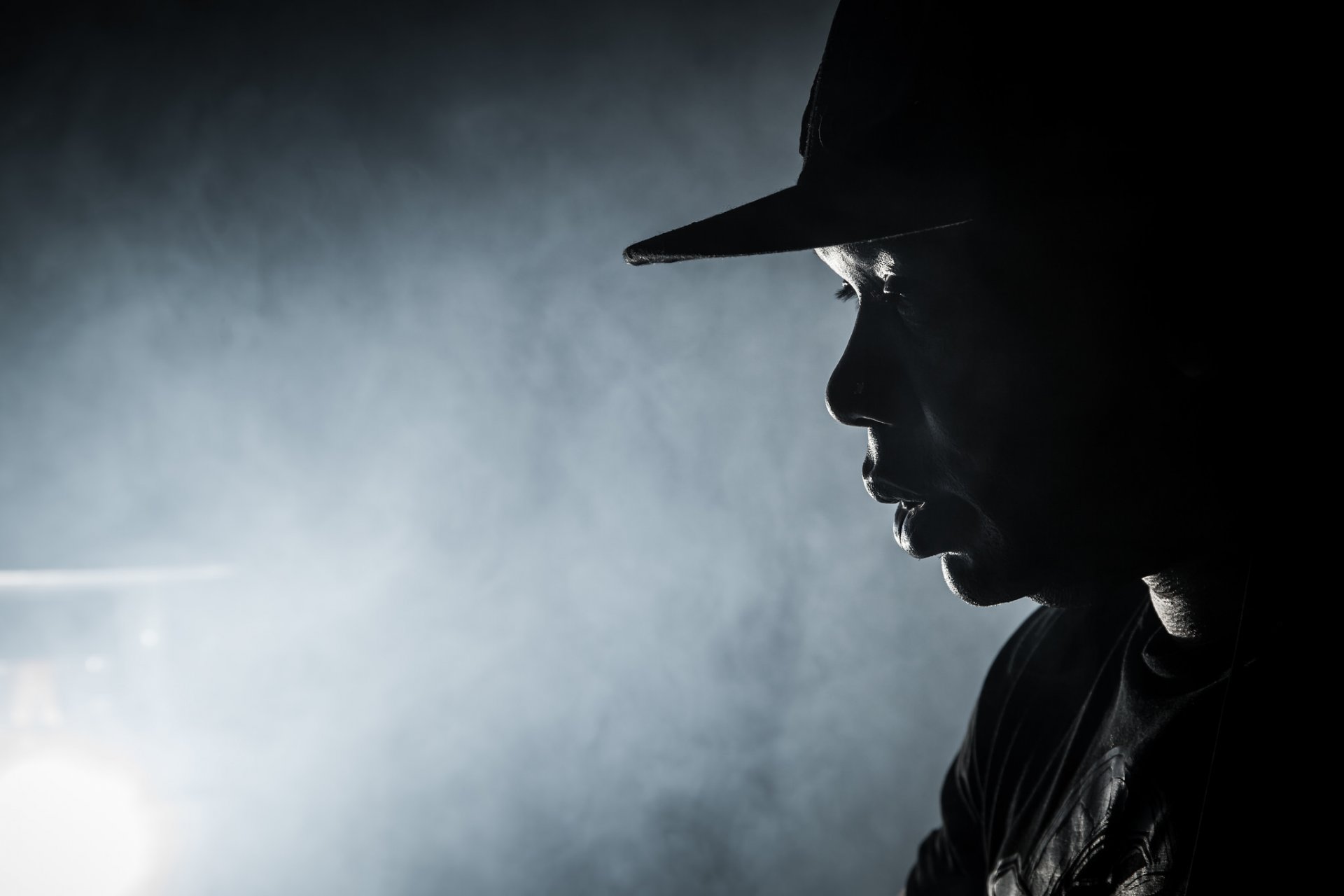 Homme noir dans un chapeau sur un fond de fumée et de phonore