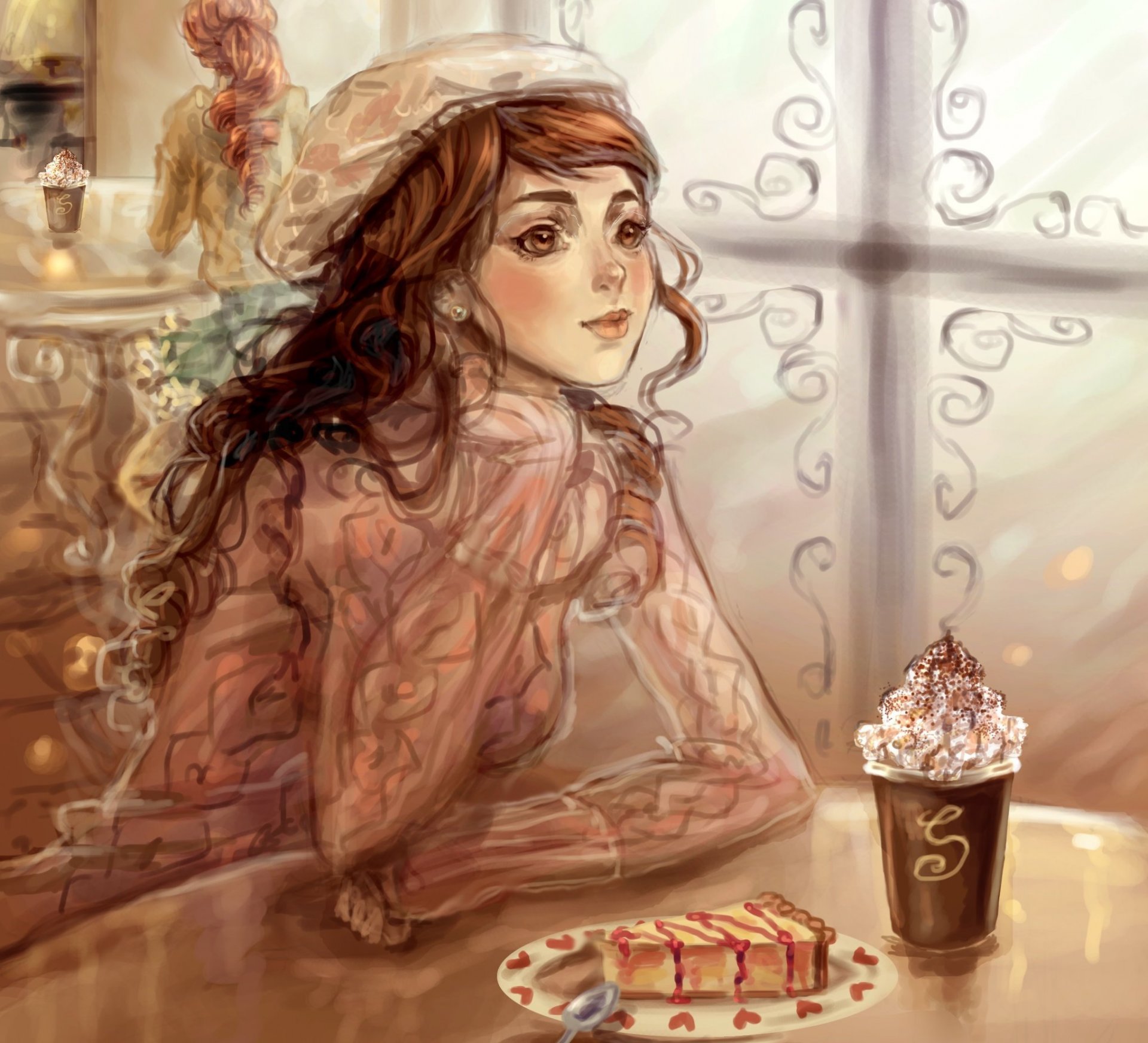 Jeune fille assise dans un café avec un gâteau