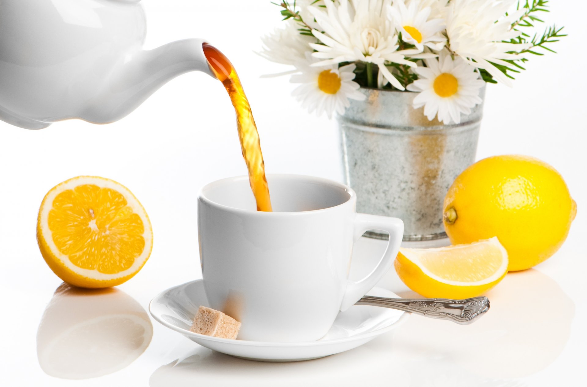 La bouilloire à thé transparente en verre remplit la tasse transparente en verre