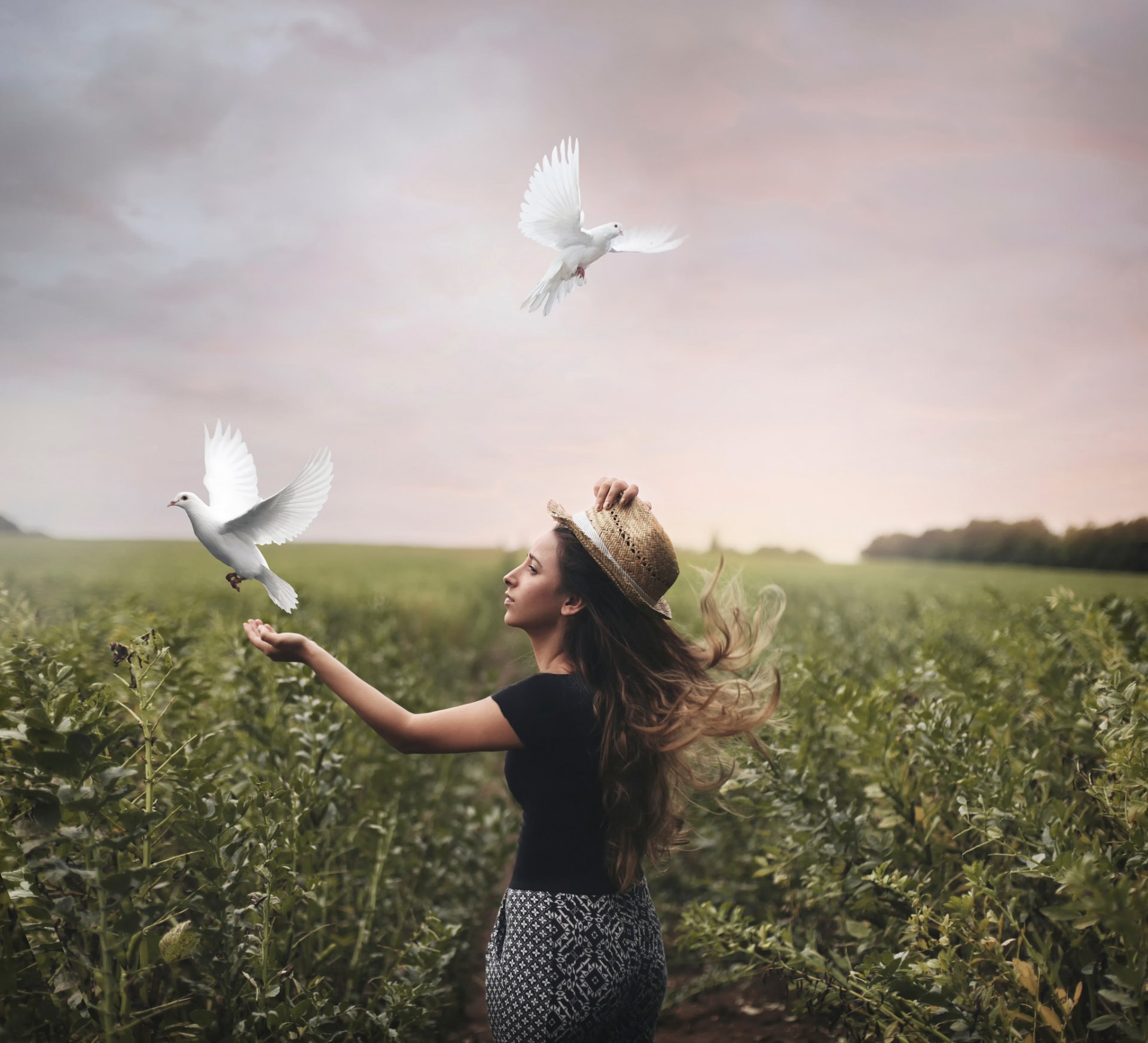 La jeune fille dans le processus de rupture sur le fond gris des nuages