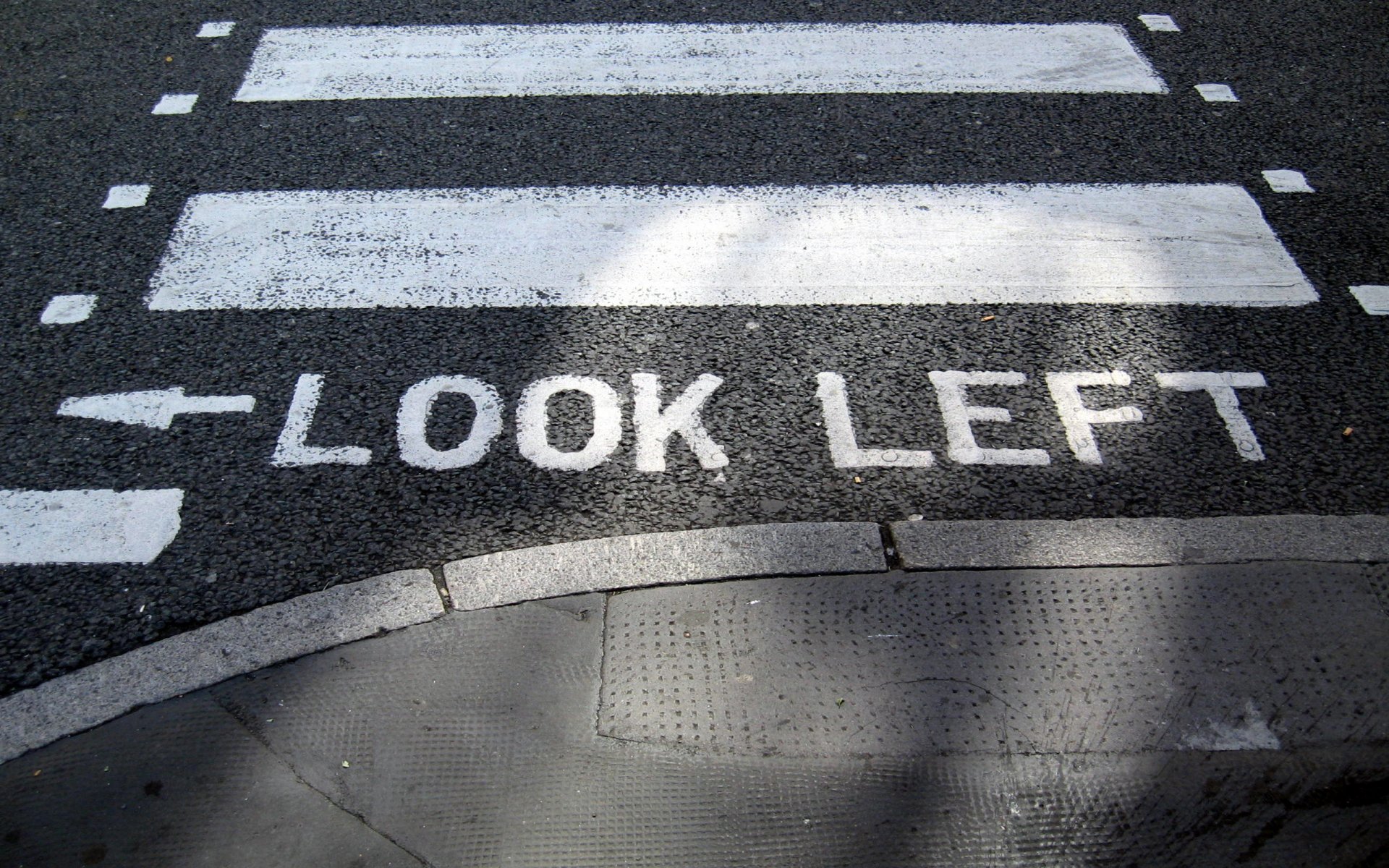 L'inscription en anglais devant le passage clouté avec dessinant une flèche et les mots, regarde à gauche