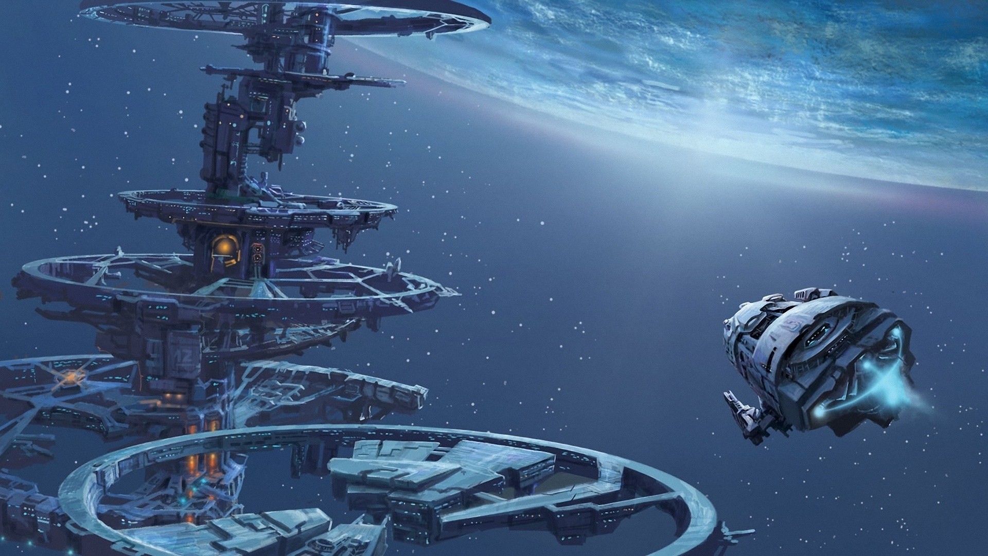 Vue de la hauteur de la ville-fille avec des armes à feu dans le vaisseau spatial