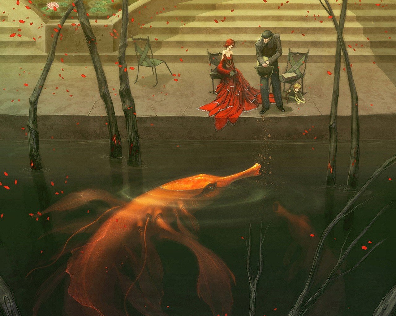 Les gens sont assis au bord d'un lac dans lequel flotte un gros poisson