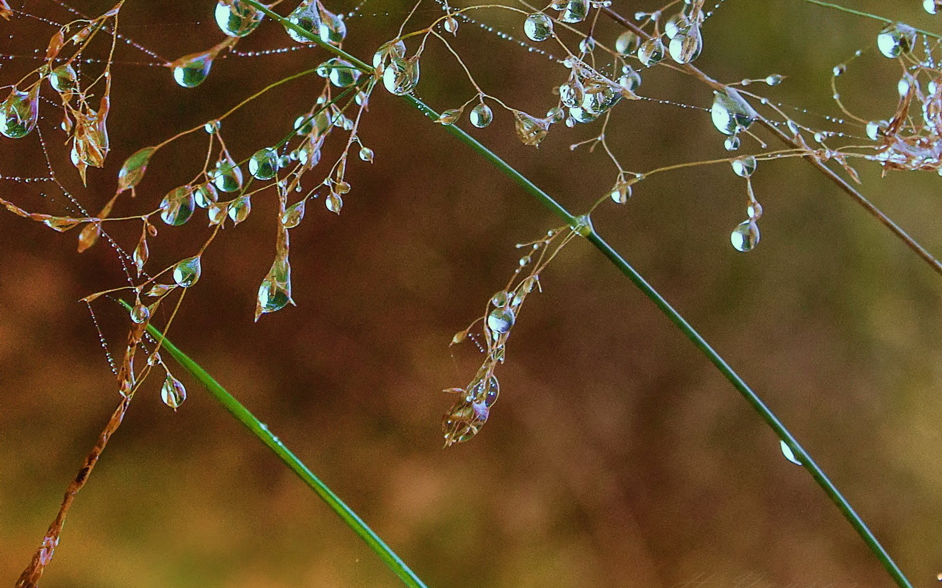 Rosée du matin sur les toiles d'araignées et les brins d'herbe