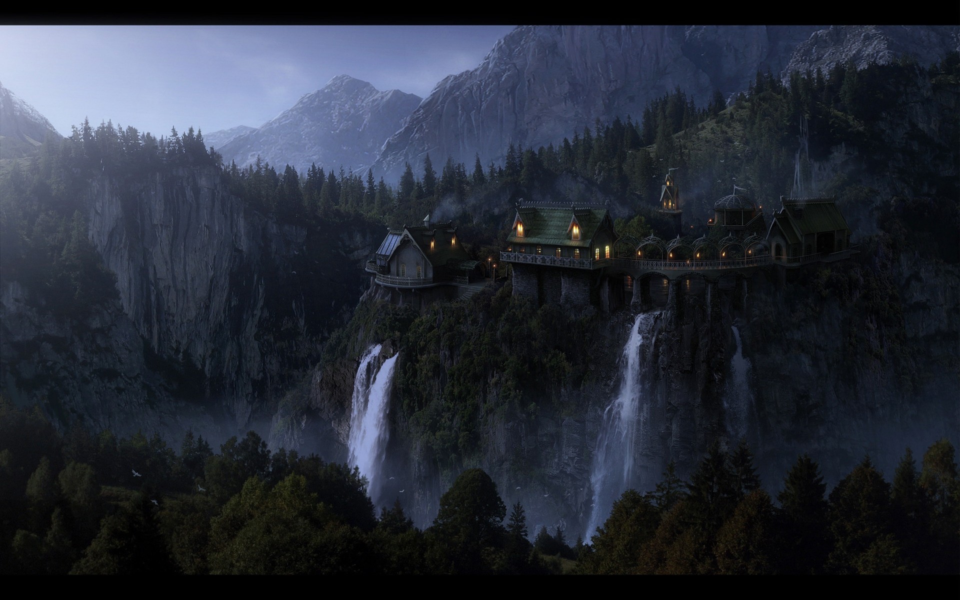 Maison dans les montagnes au milieu des arbres couverts de neige