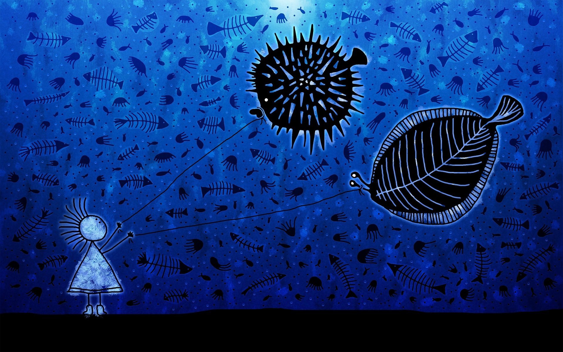 Dessin abstrait d'une fille avec un squelette de poisson et un microbe