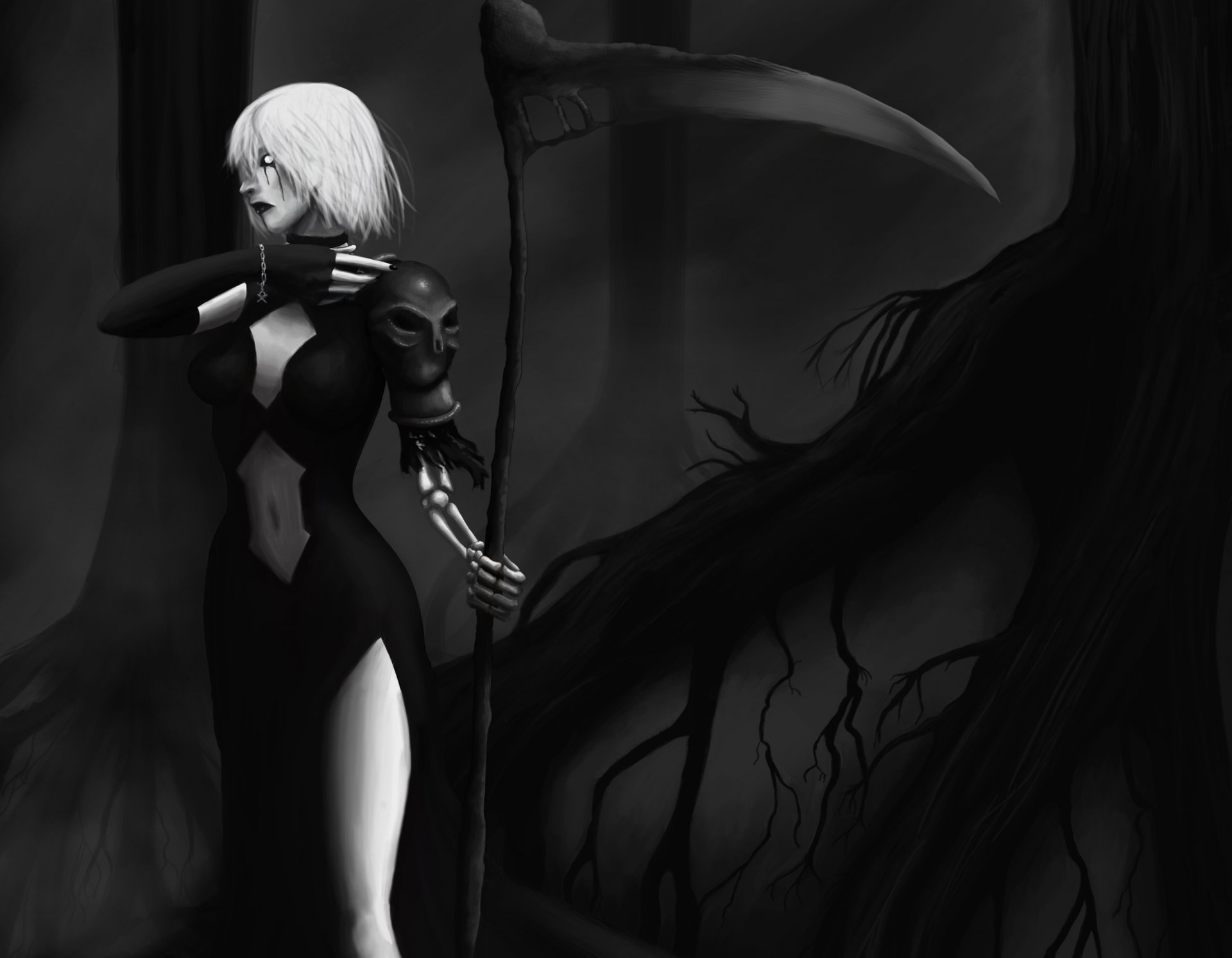 Fille aux cheveux courts blancs dans une robe noire avec une tresse sur fond de forêt noire