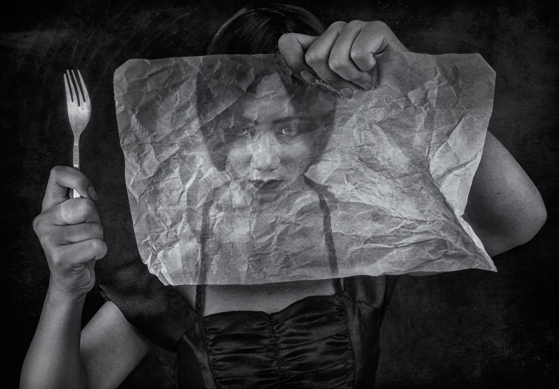 Image d'une fille avec une fourchette à travers le papier calque froissé