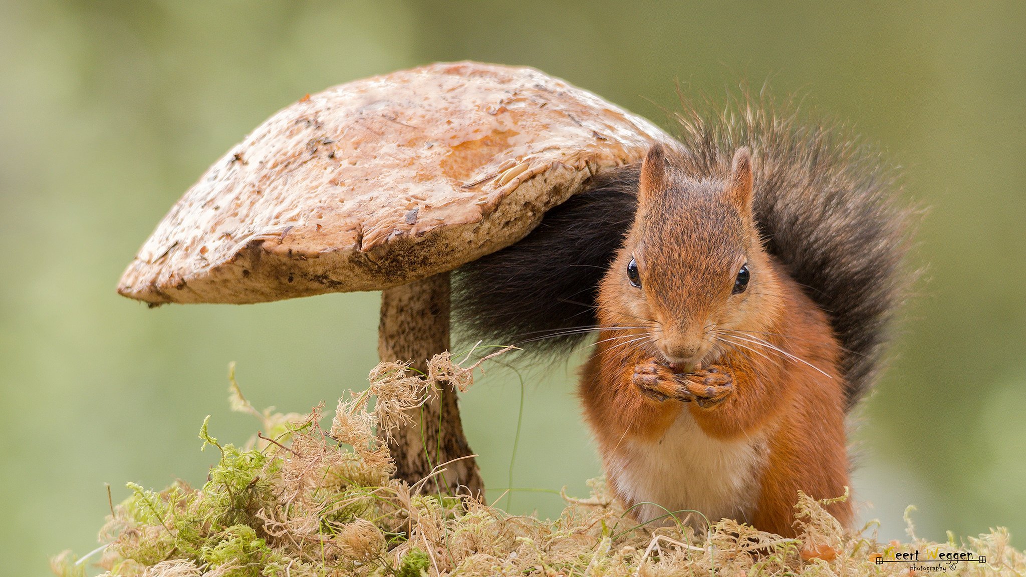 Écureuil sous un champignon dans la forêt. macrophotographie