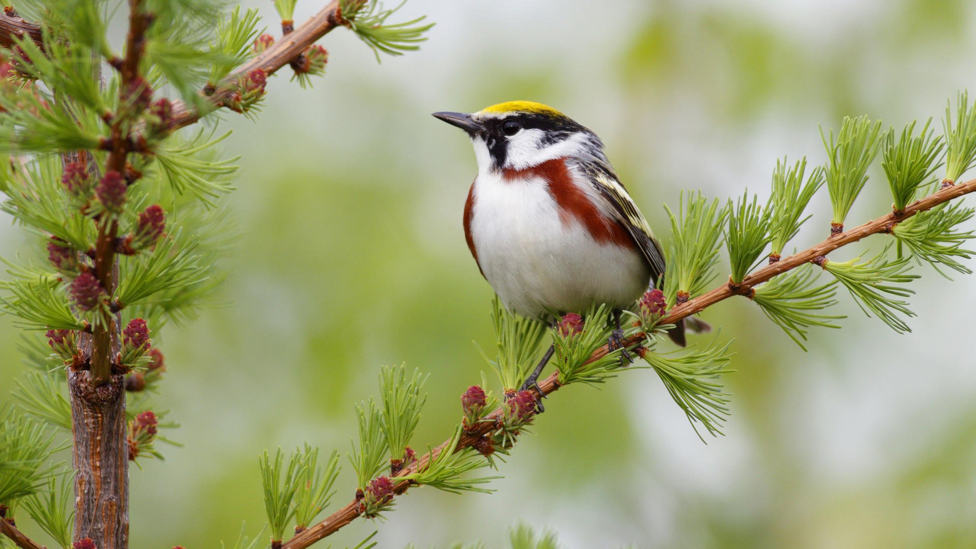 Un oiseau avec une poitrine blanche est assis sur un mélèze